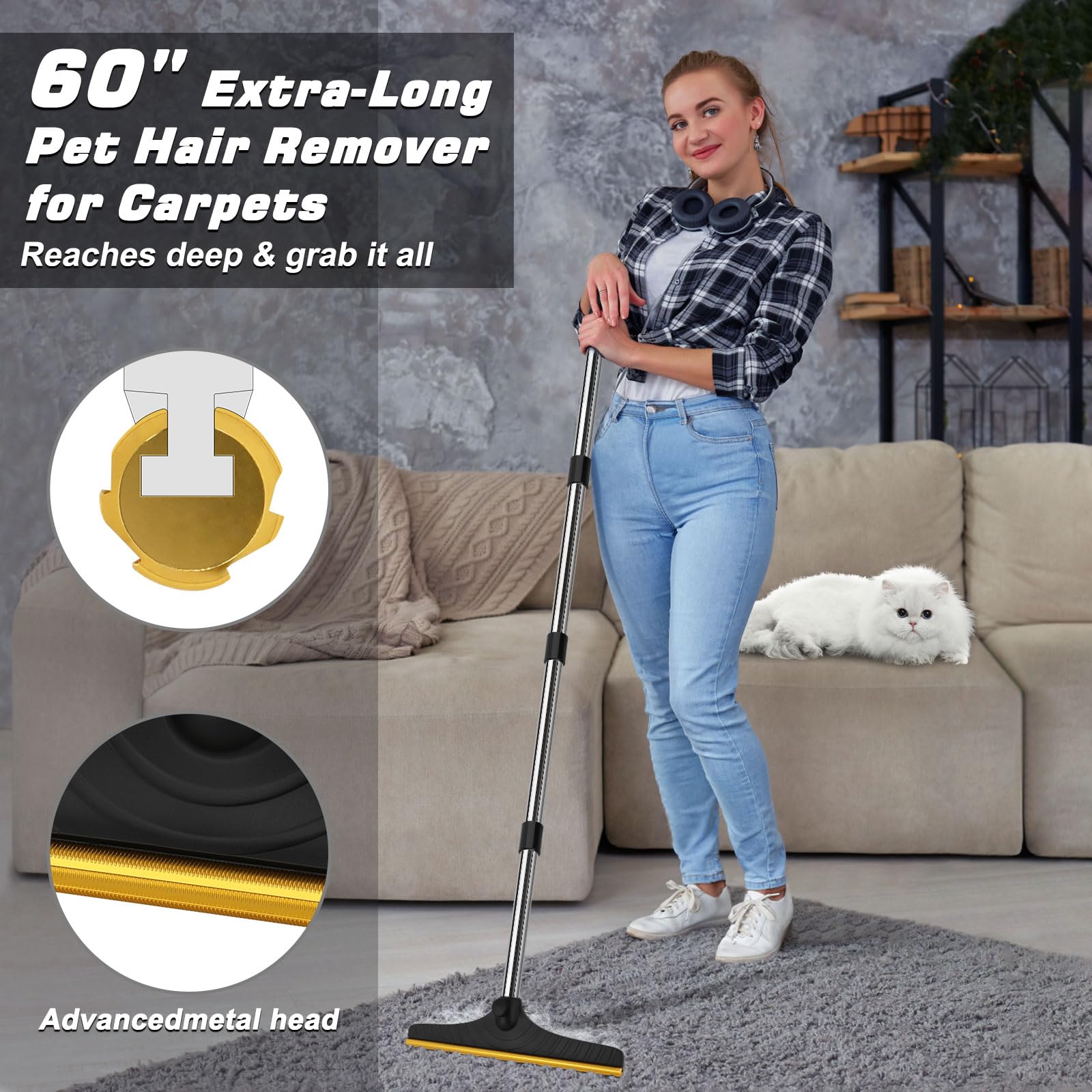 - Much Longer Handle Reaches Deep & Remove it All: The handle of the dog hair remover, composed of a session of 4 pieces of high-quality steel sections, is adjustable in length ranging from 31 to 60 inches. With its 60” extra long handle , the pet cat dog hair broom for carpet reaches even the most embedded fur & lint in a single swipe.