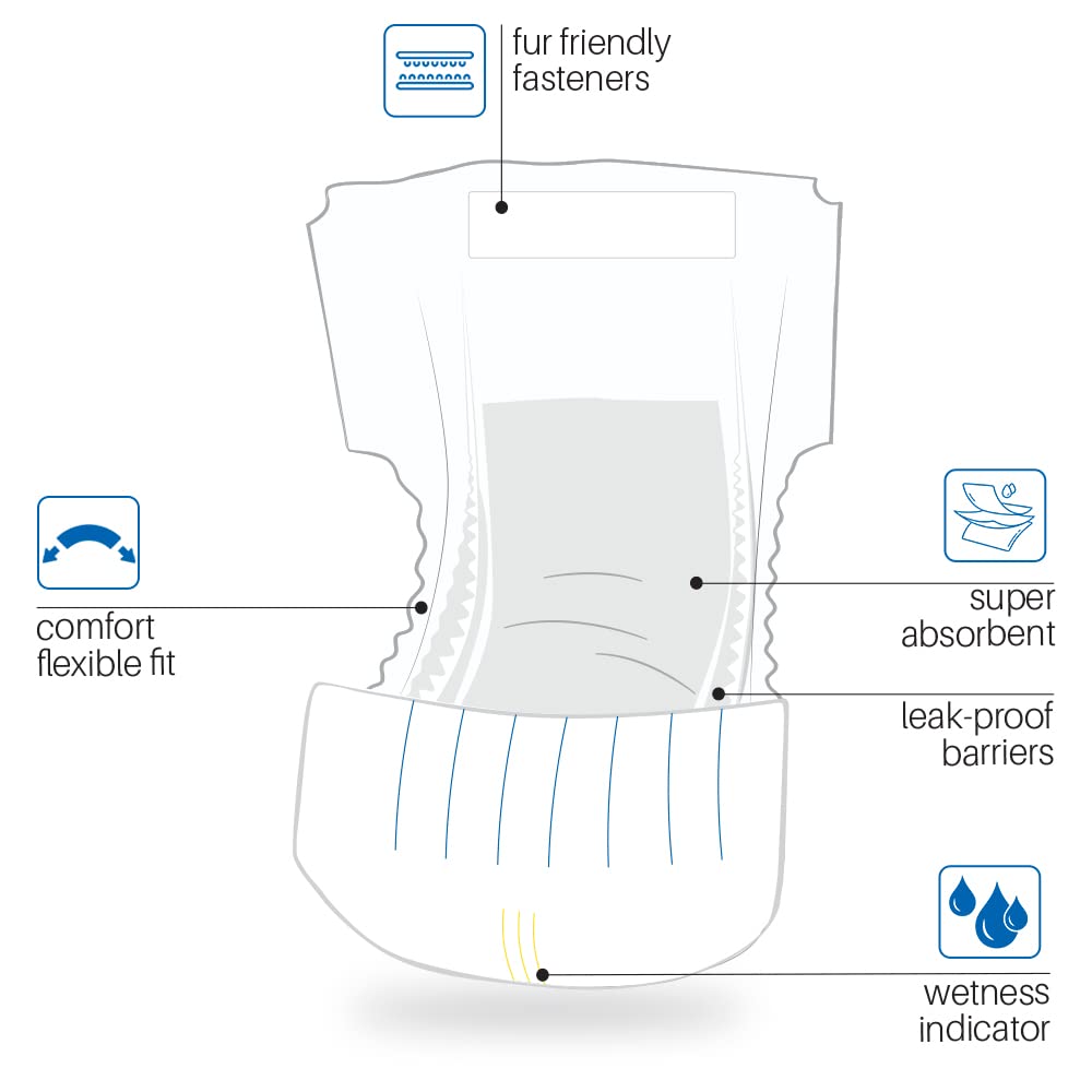 - FUR-FRIENDLY FASTENING SYSTEM: Our puppy diapers are designed with your pet's comfort in mind. The fur-friendly fastener is easily adjustable, providing a secure, irritant-free fit that accommodates even the fluffiest of friends.