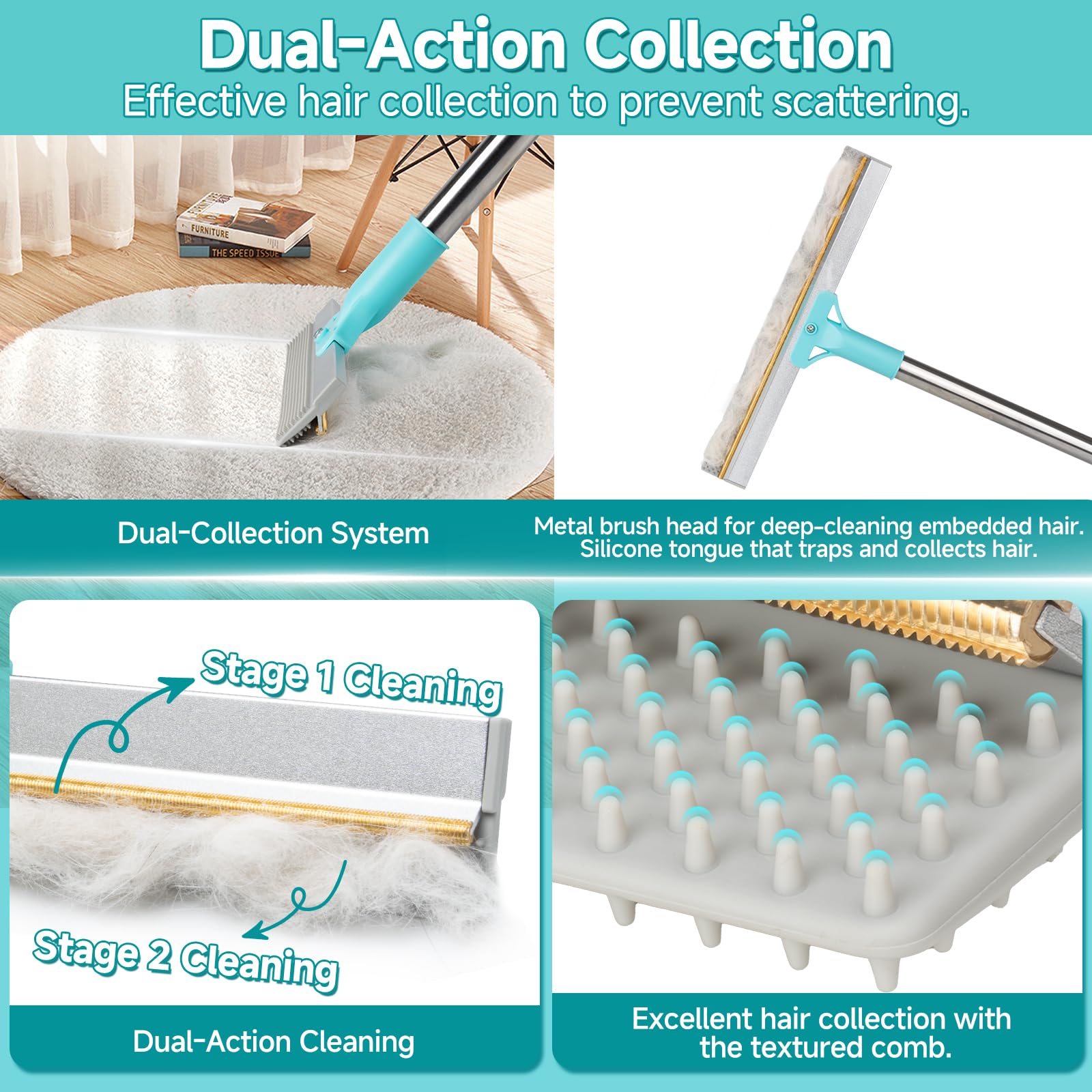- Dual-Action Cleaning System — The metal head works first, powerfully scraping and loosening deeply embedded pet hair that vacuums often miss. Then the silicone brush follows, gently gathering remaining fur and dander in one smooth pass. This powerful yet gentle combination ensures thorough cleaning on carpets, tiles, marble, and wooden floors without causing damage.