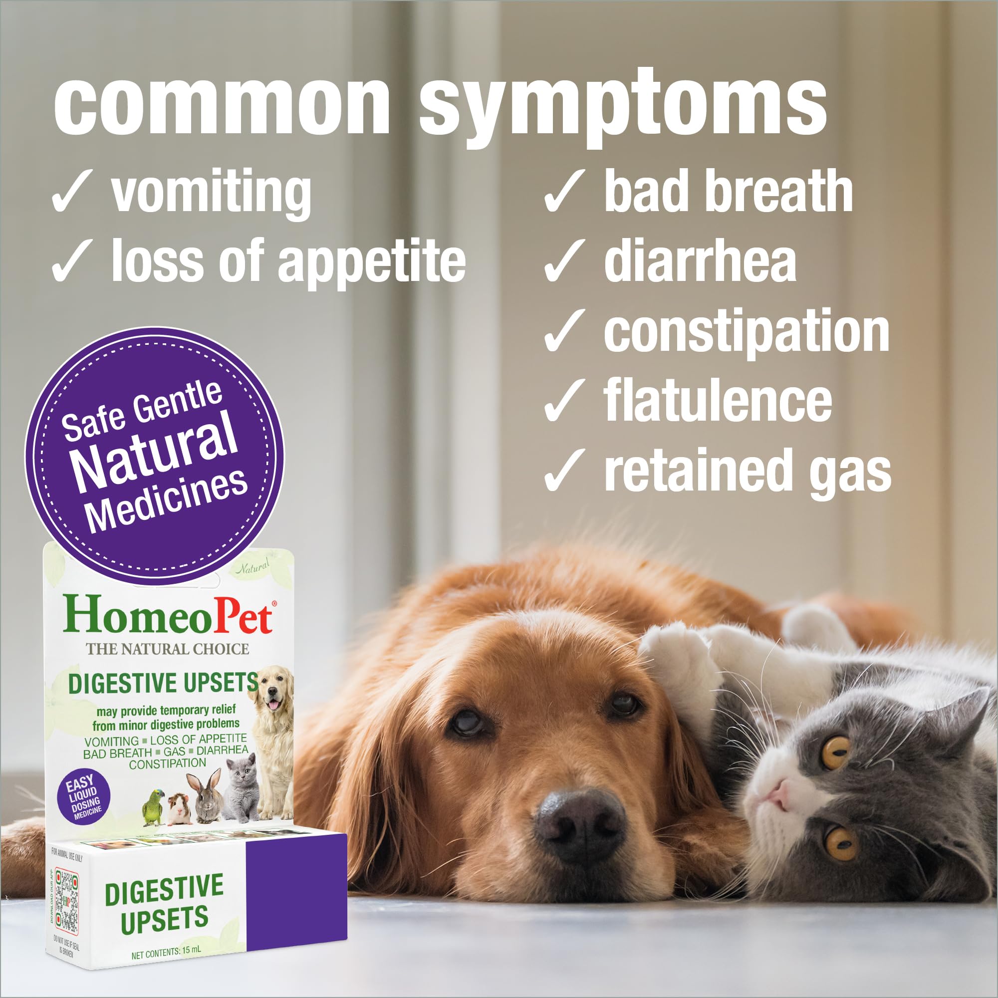 • CAT & DOG DIGESTIVE SUPPORT: HomeoPet Digestive Upsets is a natural remedy that may help support digestive function. It may help relieve frequent problems with digestion, such as vomiting, bad breath, retained gas, diarrhea, and constipation.