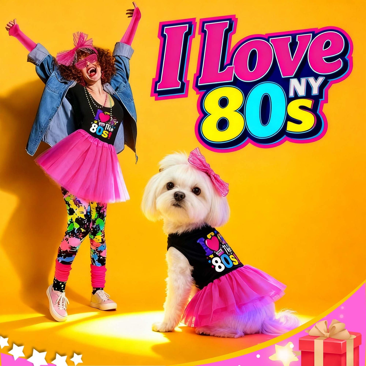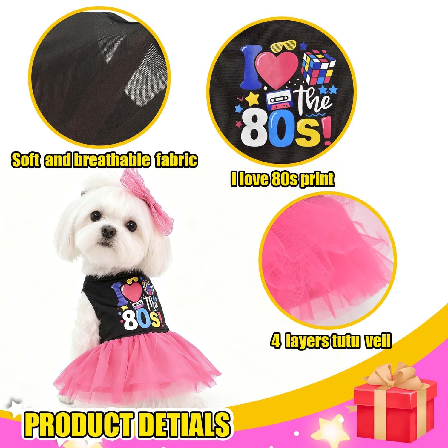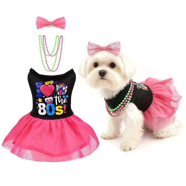 - Exquisite 1980s Design:80s Retro Dog Dress could transform your pet into the ultimate '80s diva! Featuring a hot pink tulle tutu skirt for fluffy retro vibes, a playful “I love 80s” print top for authentic nostalgia, an oversized red bow clip for extra sass, and a faux pearl necklace to complete the blinged-out look, this outfit is perfect for Halloween,costume parties,or adding vintage flair to everyday walks