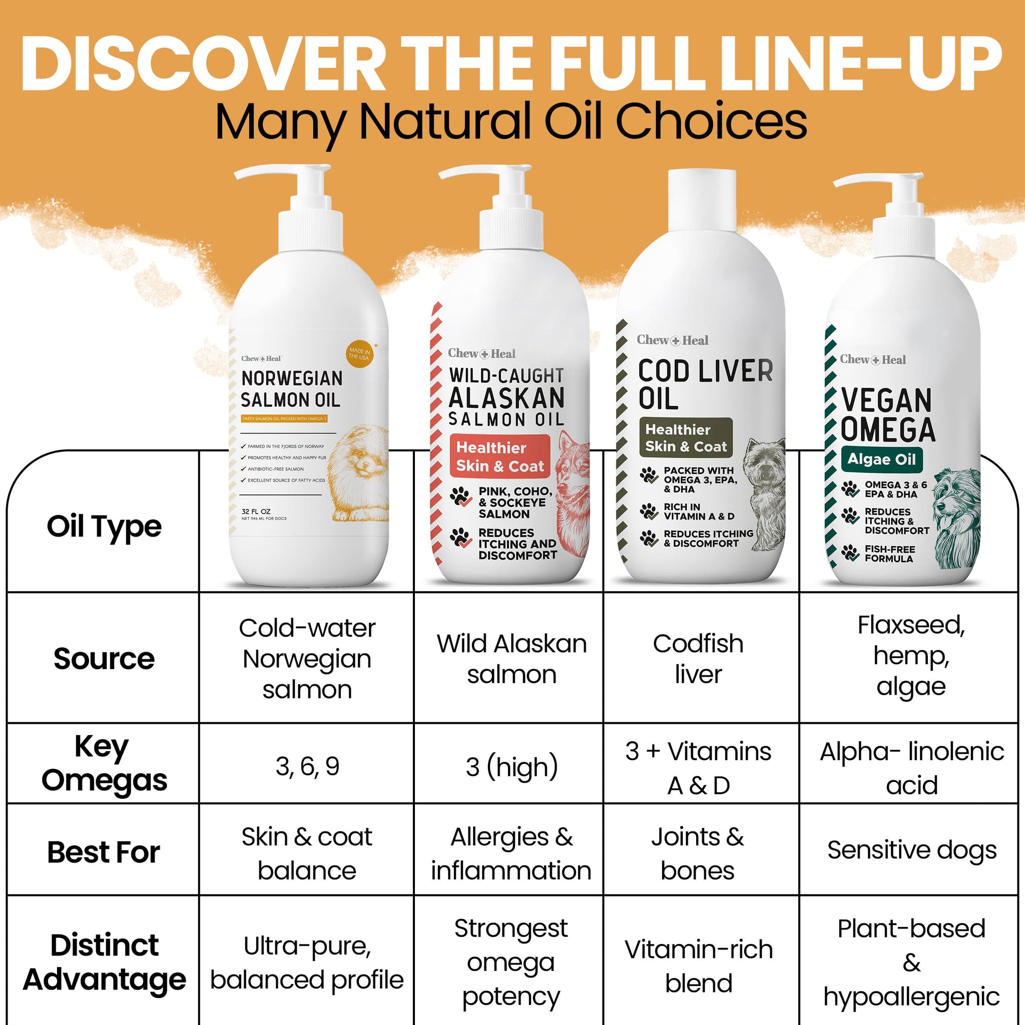 - Chew + Heal's Norwegian salmon oil for dog food is packed with omega-3 fatty acids to promote healthy and happy fur for your dog.