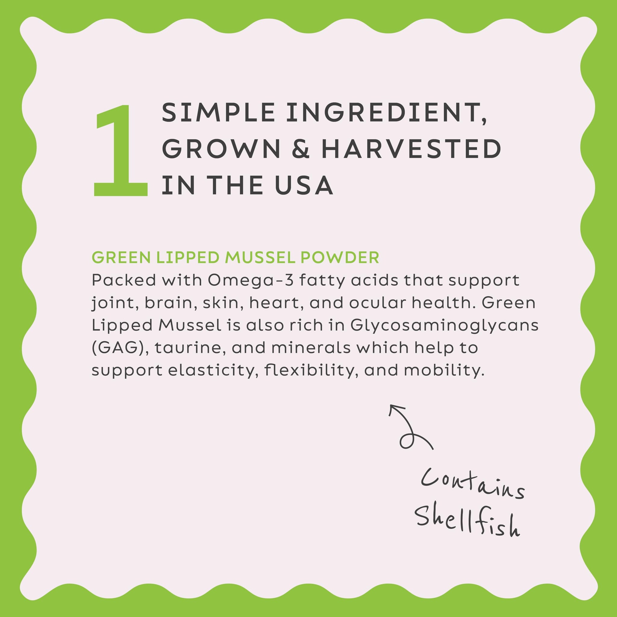 • Cat and dog hip and joint supplement made with only 1 ingredient – green lipped mussel harvested from New Zealand; packed with Glycosaminoglycans (GAG), taurine and minerals to help support elasticity, flexibility and mobility
