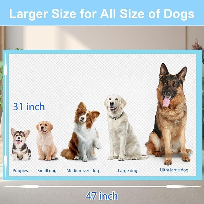 - Thicken & Leak-Proof Design: Pee pads for dogs large 50% thicker than the others! It is more efficiently to prevent floor and carpet from pet urine damage, absorb liquid faster, preventing tracking, liquid overflow, and odor. Even handy for cold wet weather, make dog training pads are easy to pick up without leakage or overflow