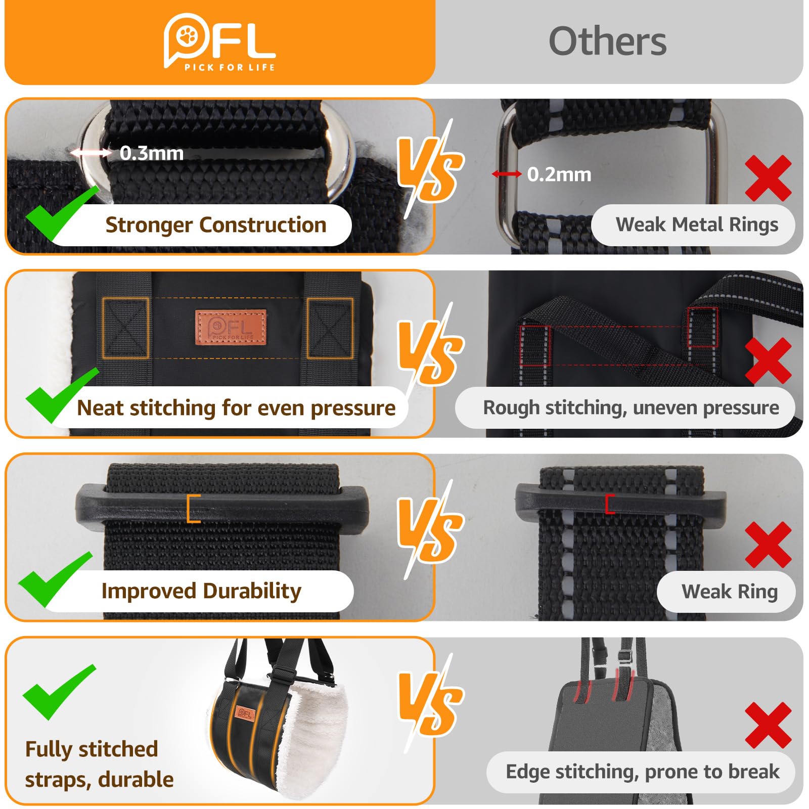 • Lifesaver: The dog carrying harness can pick up the rear end of your fur friend,prevent hip pain and injury caused by aging, support them getting in and out of the car,up and down the steps,help them get up from lying down,stabilize both the gait and spine