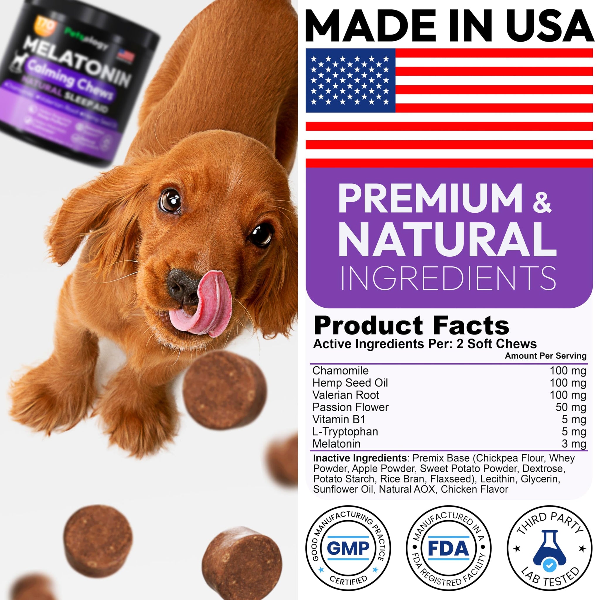 • Eases Nighttime Stress & Anxiety: These puppy melatonin chews provide natural support during thunderstorms, fireworks, separation—making them effective calming pills for dogs of all sizes and breeds.