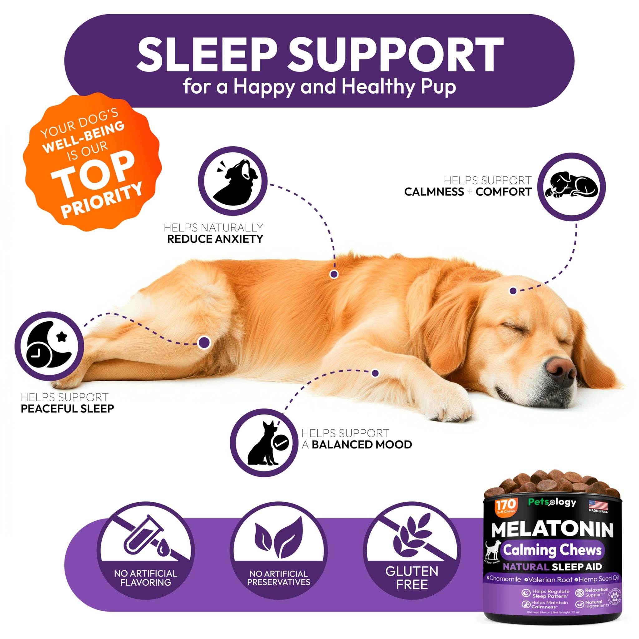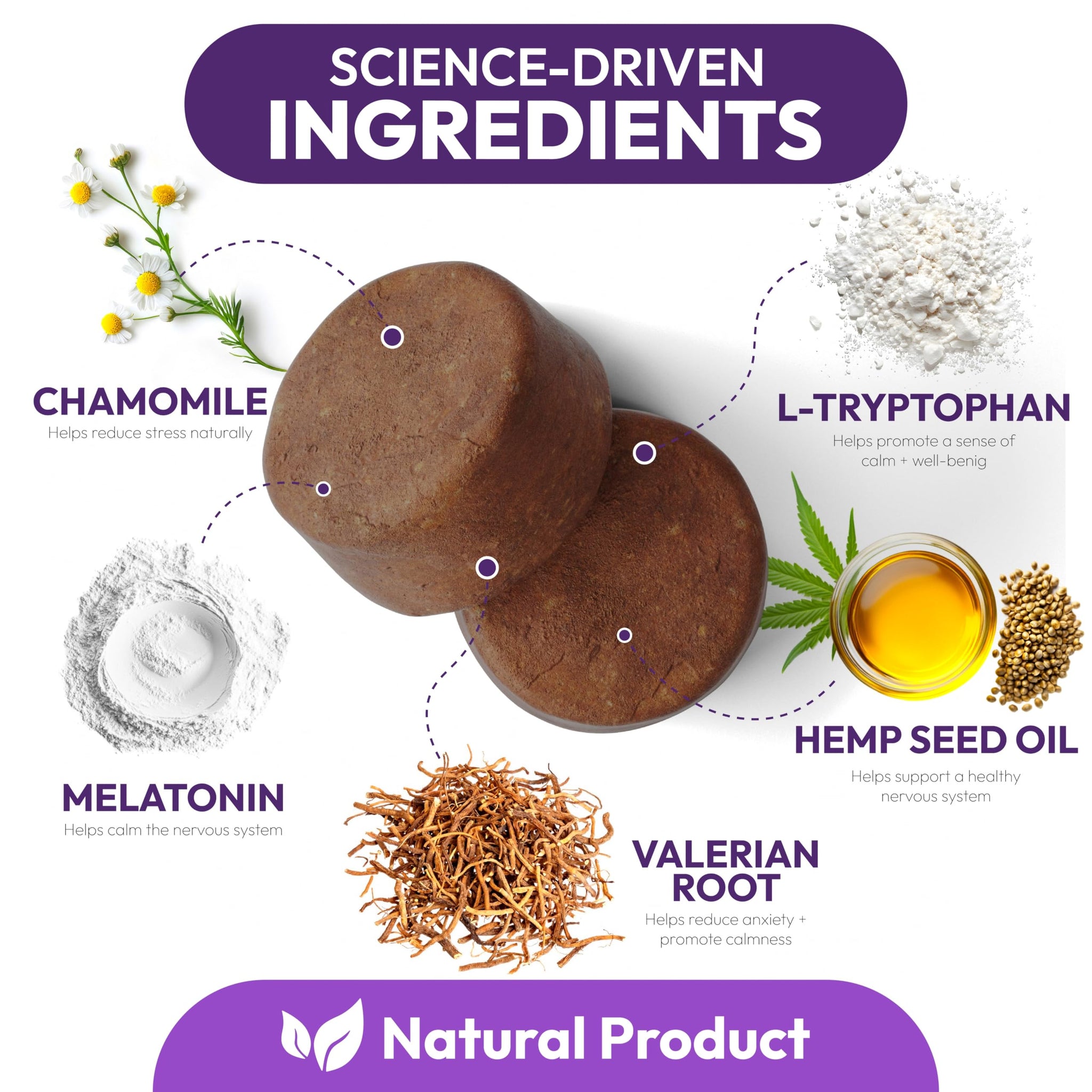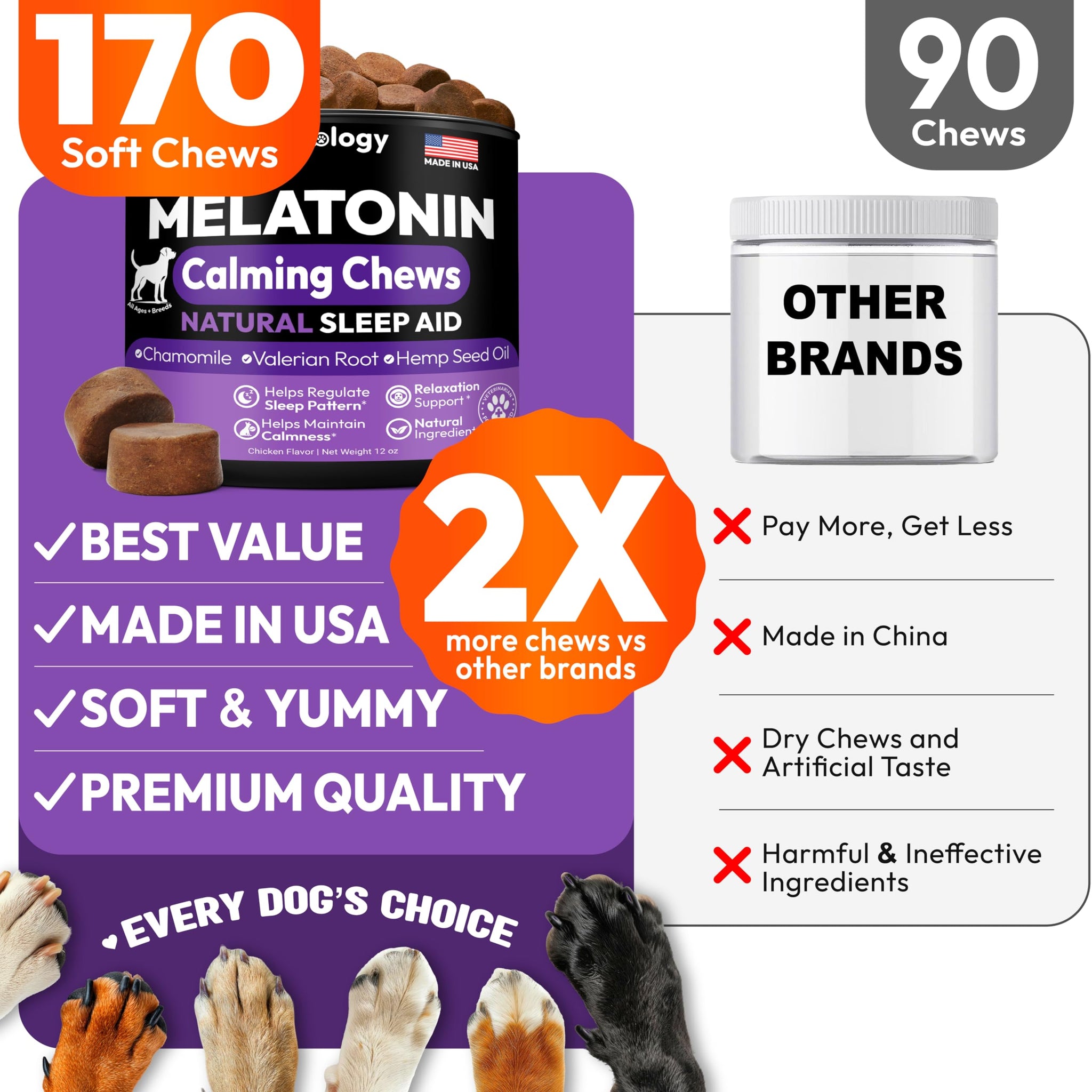 • Premium and Natural Ingredients Formulated by Veterinarians: Our formula combines melatonin with other calming nutrients to deliver safe, vet-approved sleep support in every tasty chew.