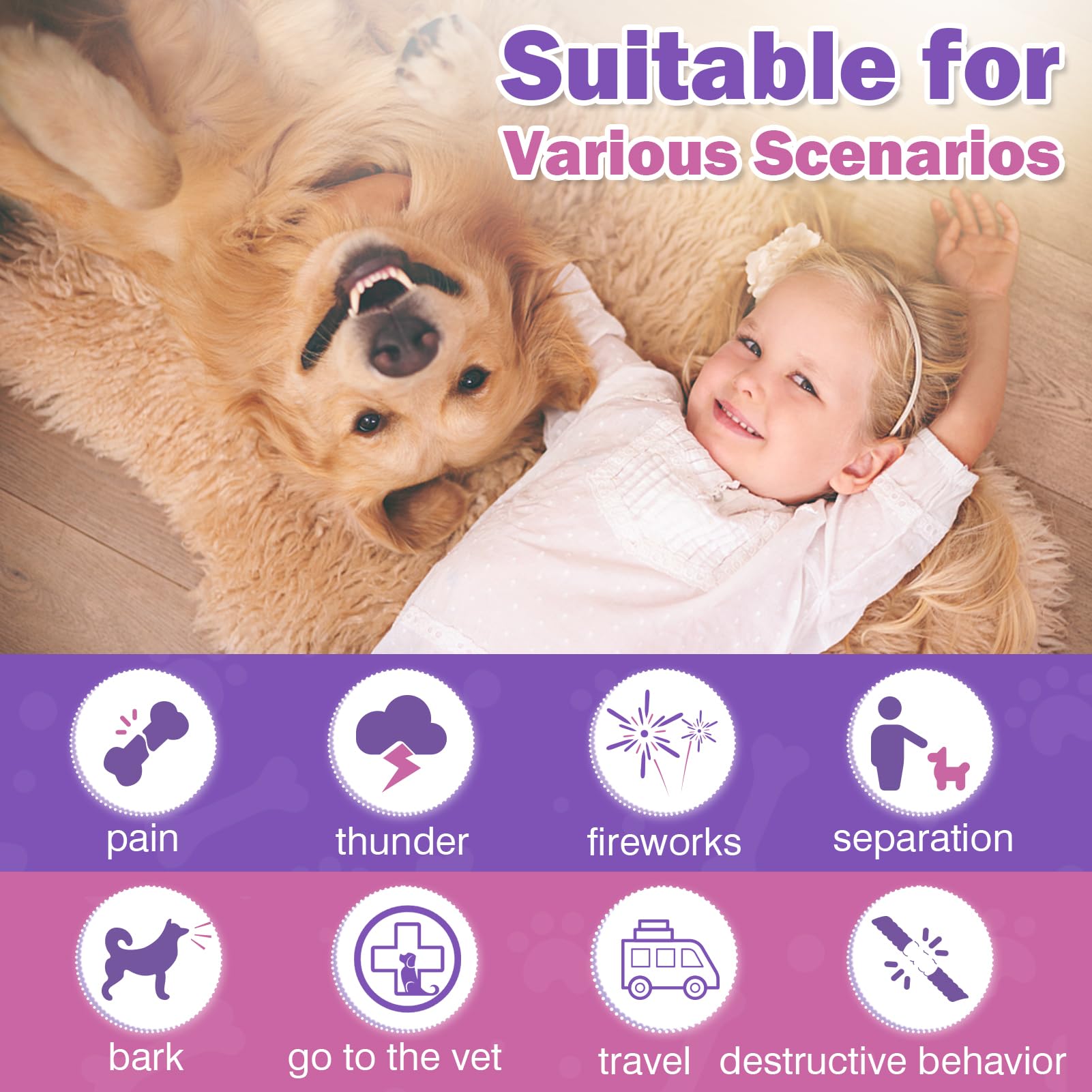 - [Promotes Dog Calm and Anxiety Relief for Dogs] Calming chews for dogs effectively soothe and reduce dog anxiety, and dog calming treat provide a sense of calmness for dog. Ideal for various situations such as thunderstorms, separations, car rides, and veterinary visits, dog calming chews help relief anxiety for dogs and find peace of mind. Dog calming treats are specifically formulated to aid in reducing anxiety and promoting better sleep in dogs. Calming chews for dogs provide dog hours of calm
