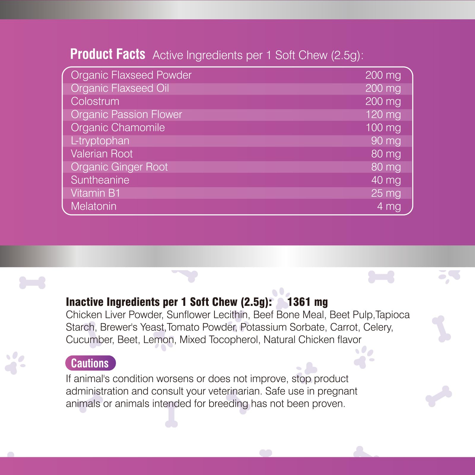 - [Safe and Harmless Calming Dog Treats] Calming chews for dogs are crafted with safe, natural ingredients that won't cause any discomfort to dog. Organic chamomile, L-tryptophan, valerian root, organic ginger root and vitamin B1 in calming treats for dogs work together to relieve puppy anxiety relief, fear or over-excitement. Free from grains, corn, or soy derivatives, calming chews dogs are natural. Ccalming dog treats are trusted choice for calming care for dogs recommended by vets