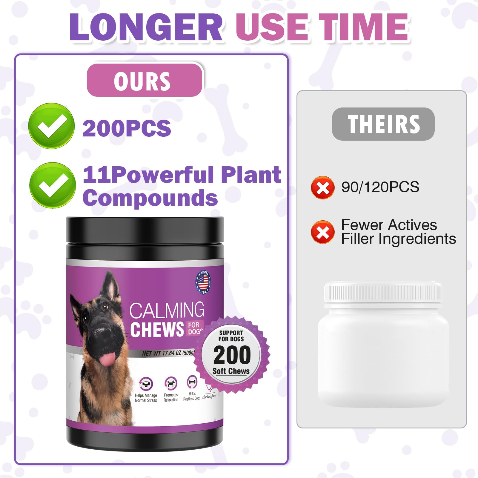 - [More Cost-Effective Calming Dog Treat] Each package contains 200 calming treats for puppies, catering to dogs of various sizes. The multi-packs of dog treats are designed for long-term use, allowing you to adjust the dosage of dogs calming chews of based on dog's needs. No matter what type of dog, calming chews for dog are effective and calming aid for dogs ensure pet calm. For more serious anxiety-related issues, it's recommended to consult veterinarian before using dog treats