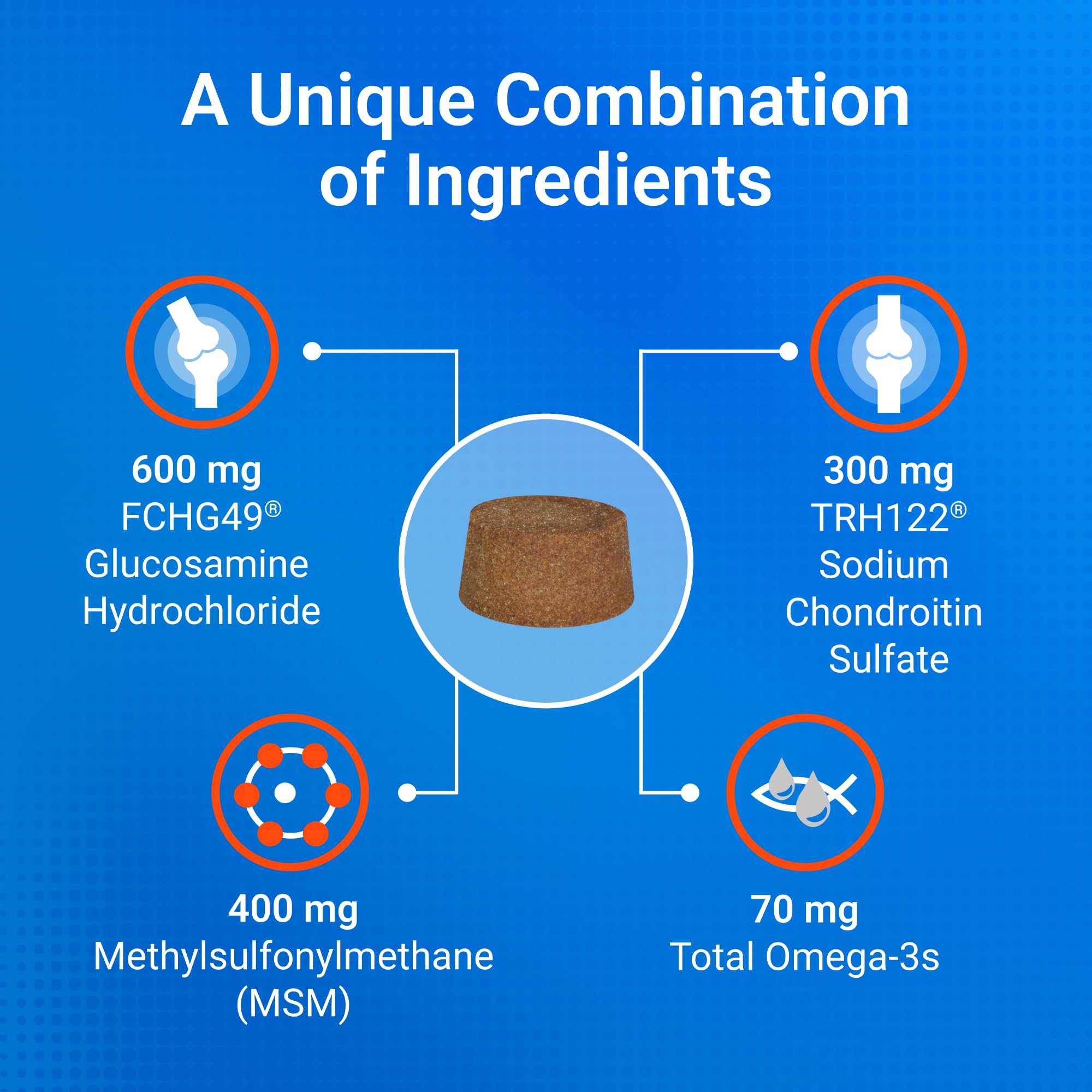 Details: Only COSEQUIN is COSEQUIN. COSEQUIN Joint Health Supplement Plus MSM & Omega-3s contain FCHG49 Glucosamine Hydrochloride, TRH122 Sodium Chondroitin Sulfate, MSM (Methylsulfonylmethane). This combination of ingredients helps maintain your dog’s cartilage and connective tissue. Each soft chew also contains omega-3 fatty acids to help support skin & coat health. COSEQUIN supplements have been used since 1992 in animals to maintain joint health. COSEQUIN supplements have been shown safe, effective, and absorbable in peer-reviewed, published, controlled, U.S. veterinary studies. Each batch of COSEQUIN is subjected to stringent quality control measures and meets label claim.Tasty easy to give soft chews