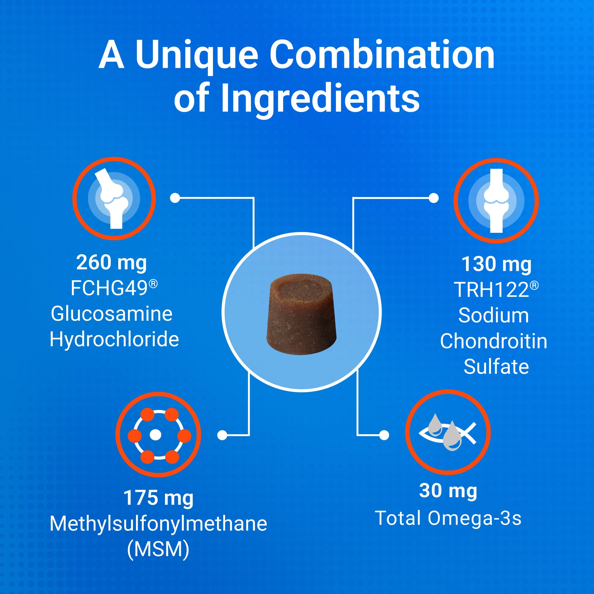 - Contains Glucosamine for Dogs - Cosequin contains glucosamine hydrochloride (FCHG49) and sodium chondroitin sulfate (TRH122), plus methylsulfonylmethane (MSM). This unique combination of ingredients supports healthy joints.