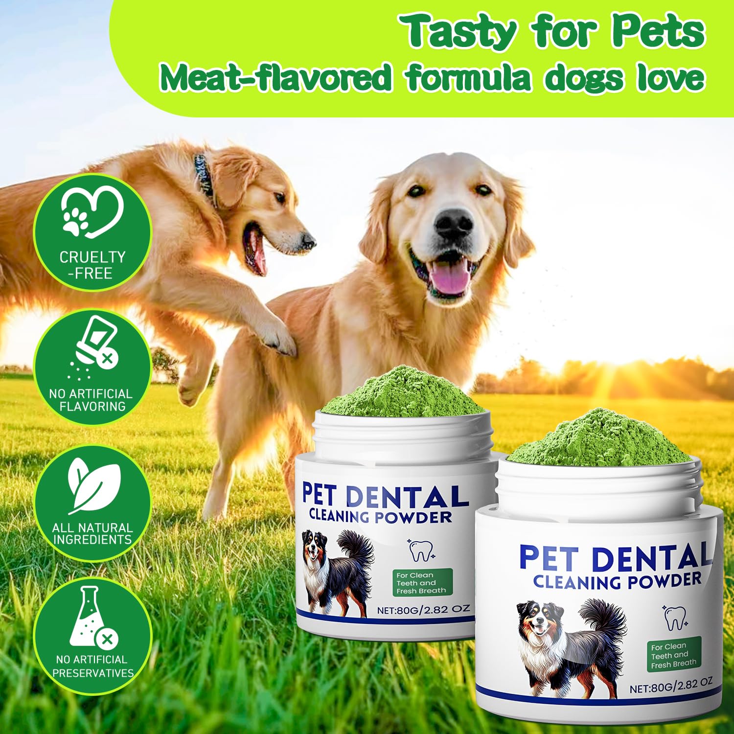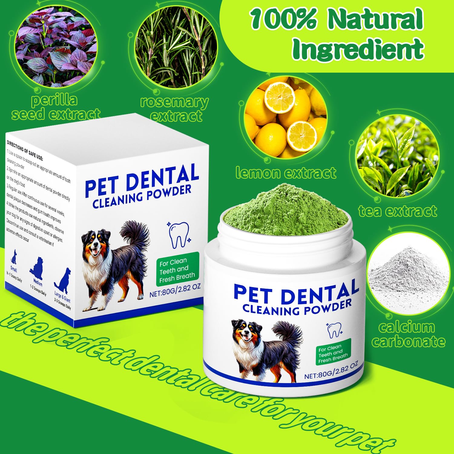 - Dog Teeth Cleaning Powder: Simplify dental care with our dog teeth cleaning powder. This blend of natural ingredients fights bad breath and supports healthy teeth and gums. Simply sprinkle over food, perfect for dogs who hate toothbrushing! Saves time while maintaining dental hygiene.