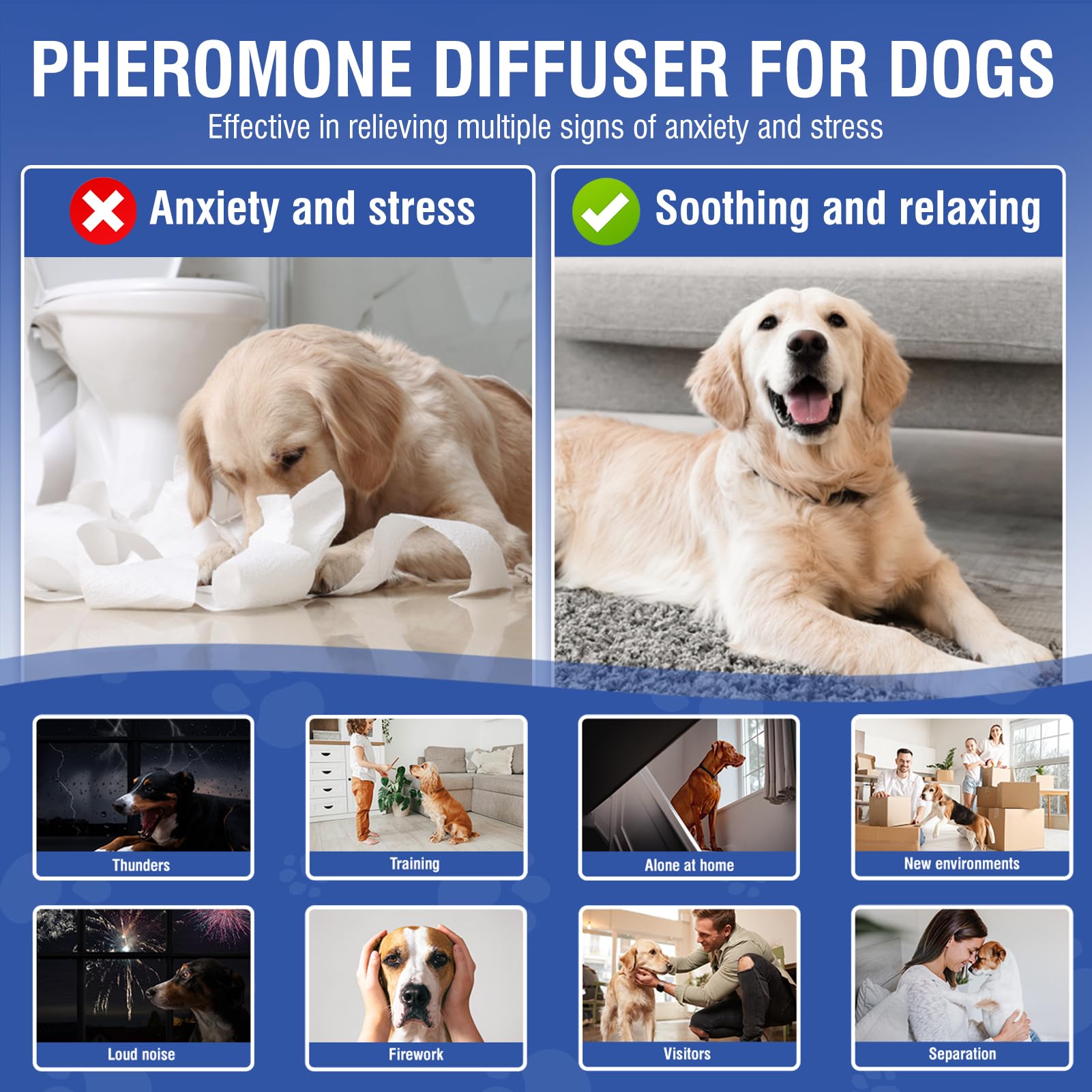 - 【Multifunctional Anxiety Relief】Dog calming diffuser is not only a sedative product, tasteless pheromones diffuser is designed to solve a variety of anxiety problems, pheromone by imitating the mother's pheromones, sending strong safety and comfort signals to dogs, so that they gradually calm down. Dog pheromone diffuser effectively relieves fear or stress caused by fear, noise, traffic, travel, veterinary visits, home alone, fireworks, thunderstorms, separation anxiety, etc