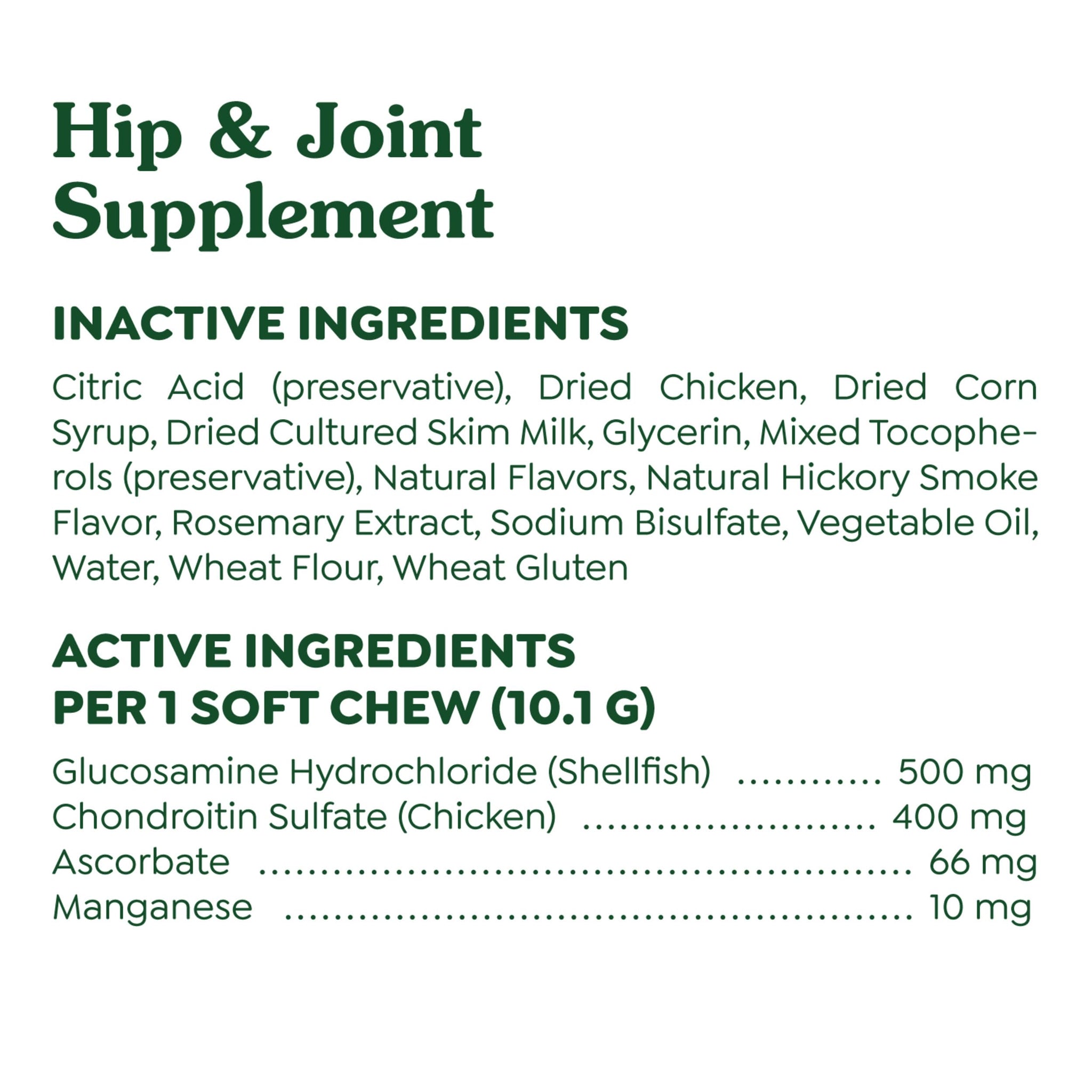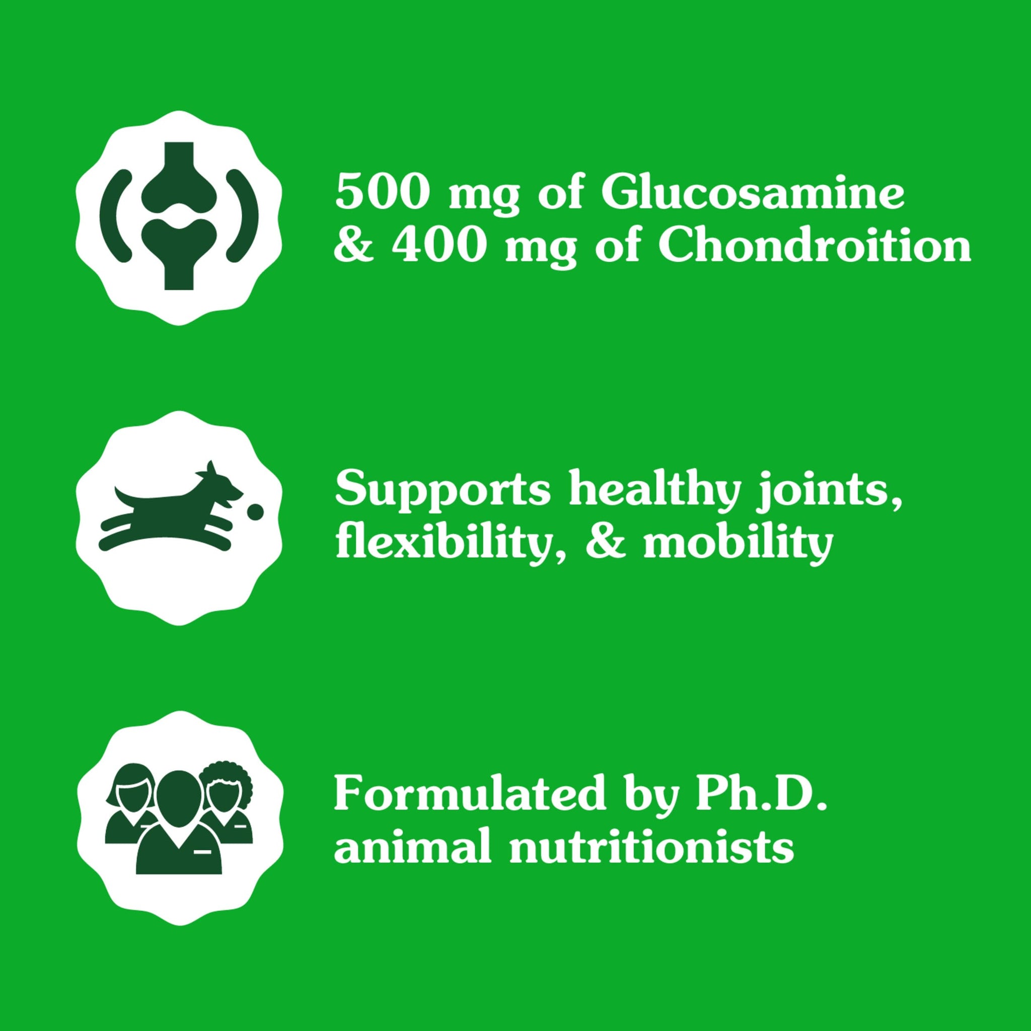 - Active Ingredients: Each irresistible soft chew is formulated with 500 mg of Glucosamine & 400 mg of Chondroitin from natural sources which are key building blocks for the maintenance of healthy joint cartilage
