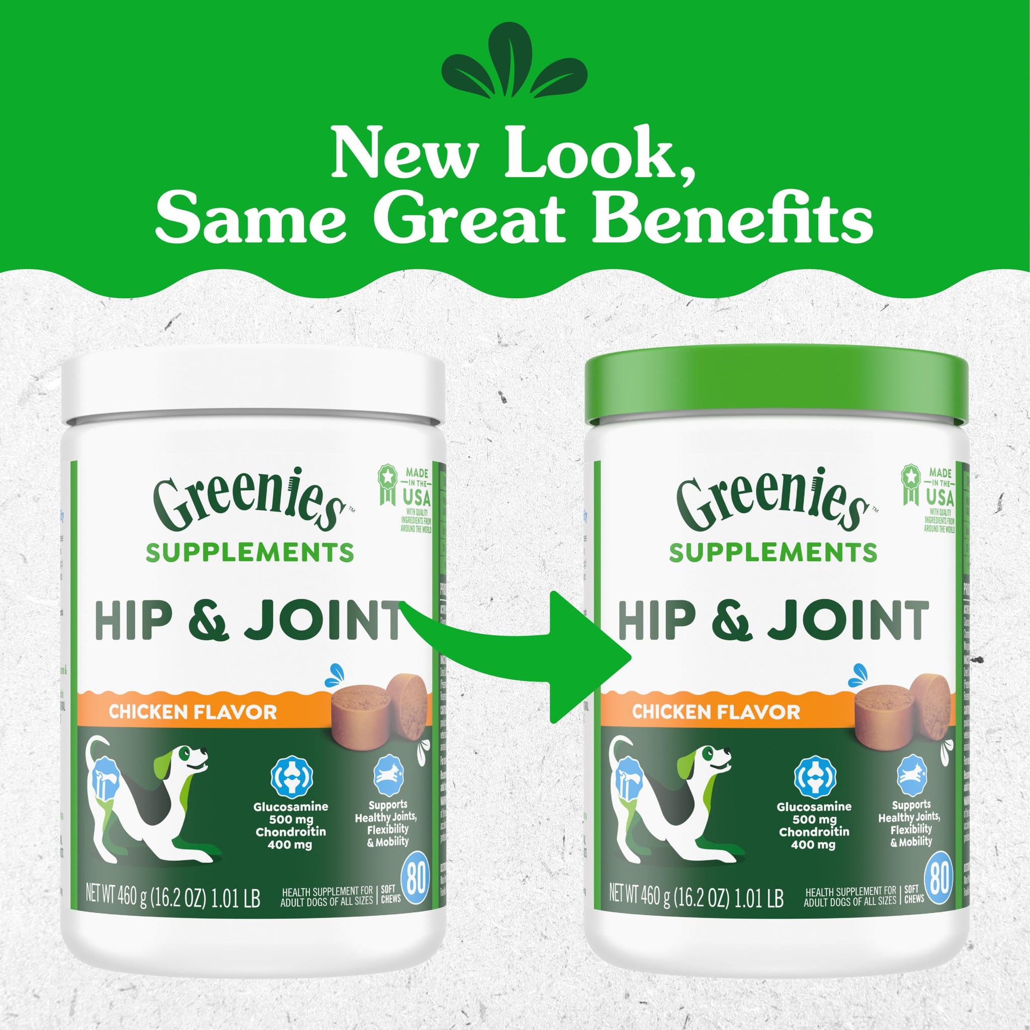 Details: From the makers of veterinarian recommended Greenies Dental Treats, Greenies Supplements make it easy to support your dog's health. Supplement your dog's joint health with Greenies Hip & Joint Supplements, formulated by a team of Ph.D. Animal Nutritionists to support healthy joints, flexibility and mobility. Made for adult dogs of all sizes, Greenies Hip & Joint Supplement Contains active ingredients Glucosamine, Chondroitin and Manganese to help your dog continue to be active. These soft chews are made with real chicken for irresistible taste and are formulated without artificial flavors, colors or preservatives and no fillers. Plus they are made in the USA with quality ingredients from around the world and contain the National Animal Supplements Council Quality Seal. Simply give once a day to help your dog be at their best and enjoy happy days together.
