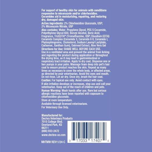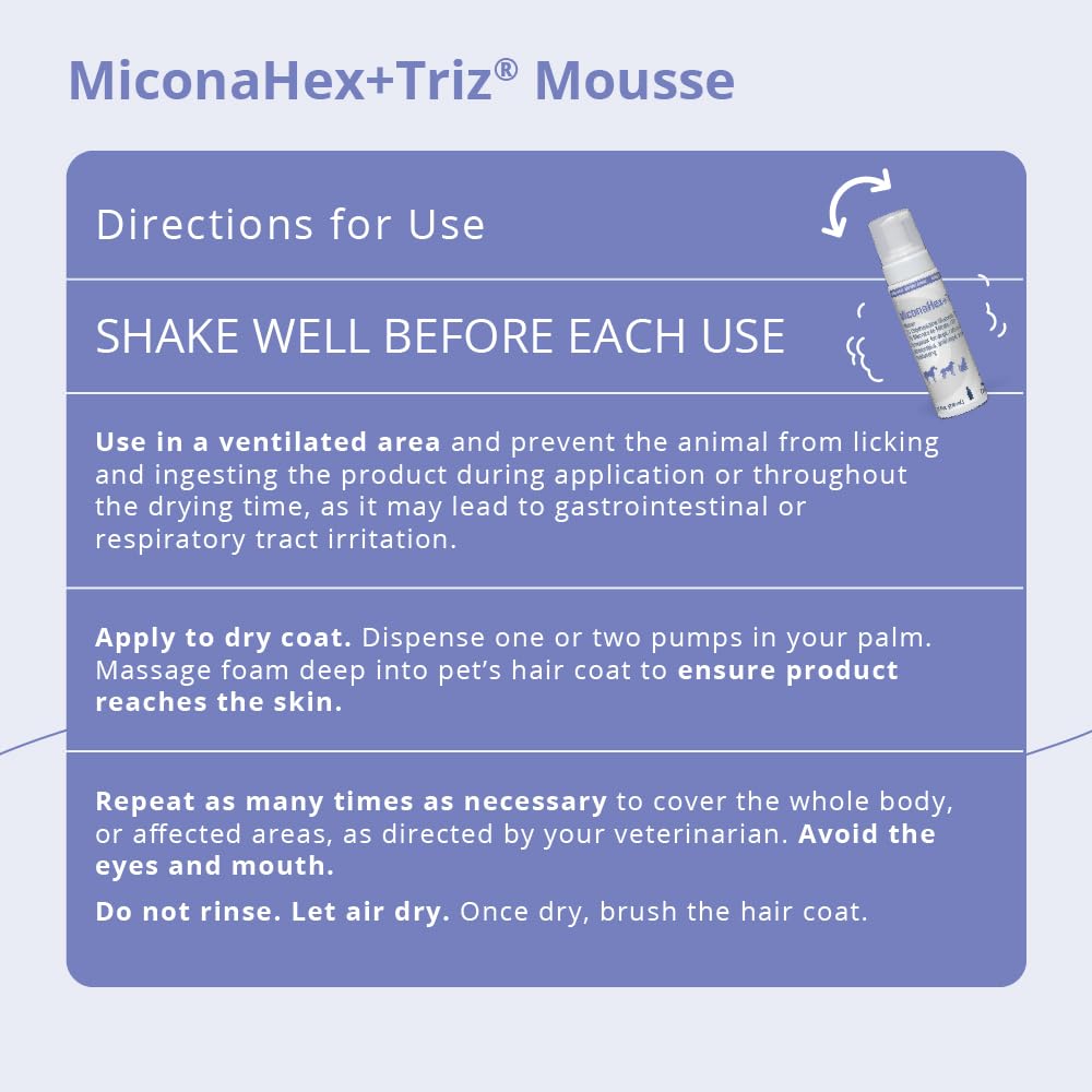 Details: An easy-to-use mousse which is indicated for coat and skin conditions where the following properties would be beneficial to the patient: antifungal, antibacterial, and barrier repair.