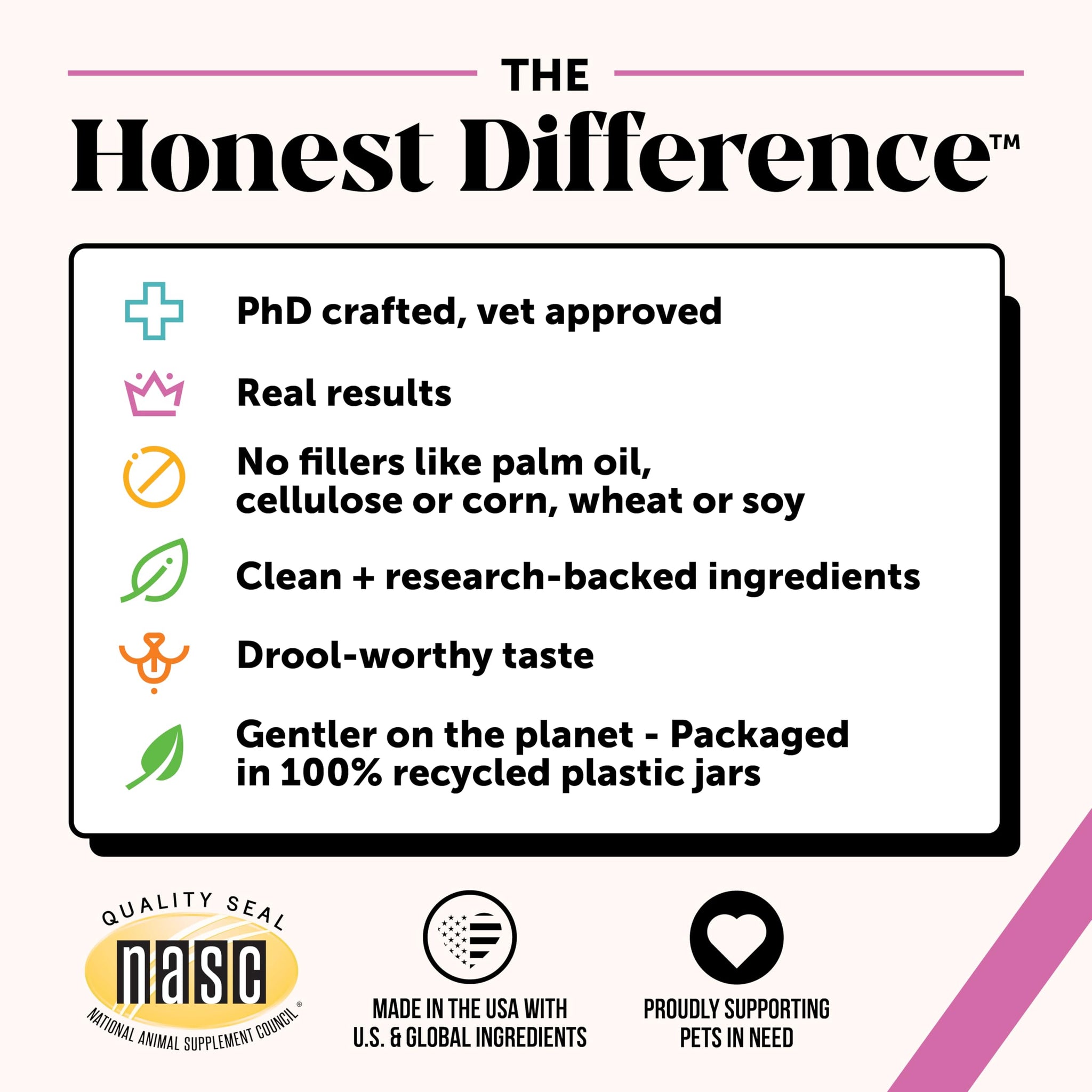 - THE HONEST DIFFERENCE: Our products are made with clean, science-backed ingredients for results you can trust, & with no fillers, artificial preservatives, colors, or flavors, you'll have no doubt your dog is getting the best. Proudly supporting pets in need nationwide & using recycled plastic in our packaging, there's also no doubt that we're committed to doing our best. -- All products are manufactured in the U.S.A. | NASC Member Company