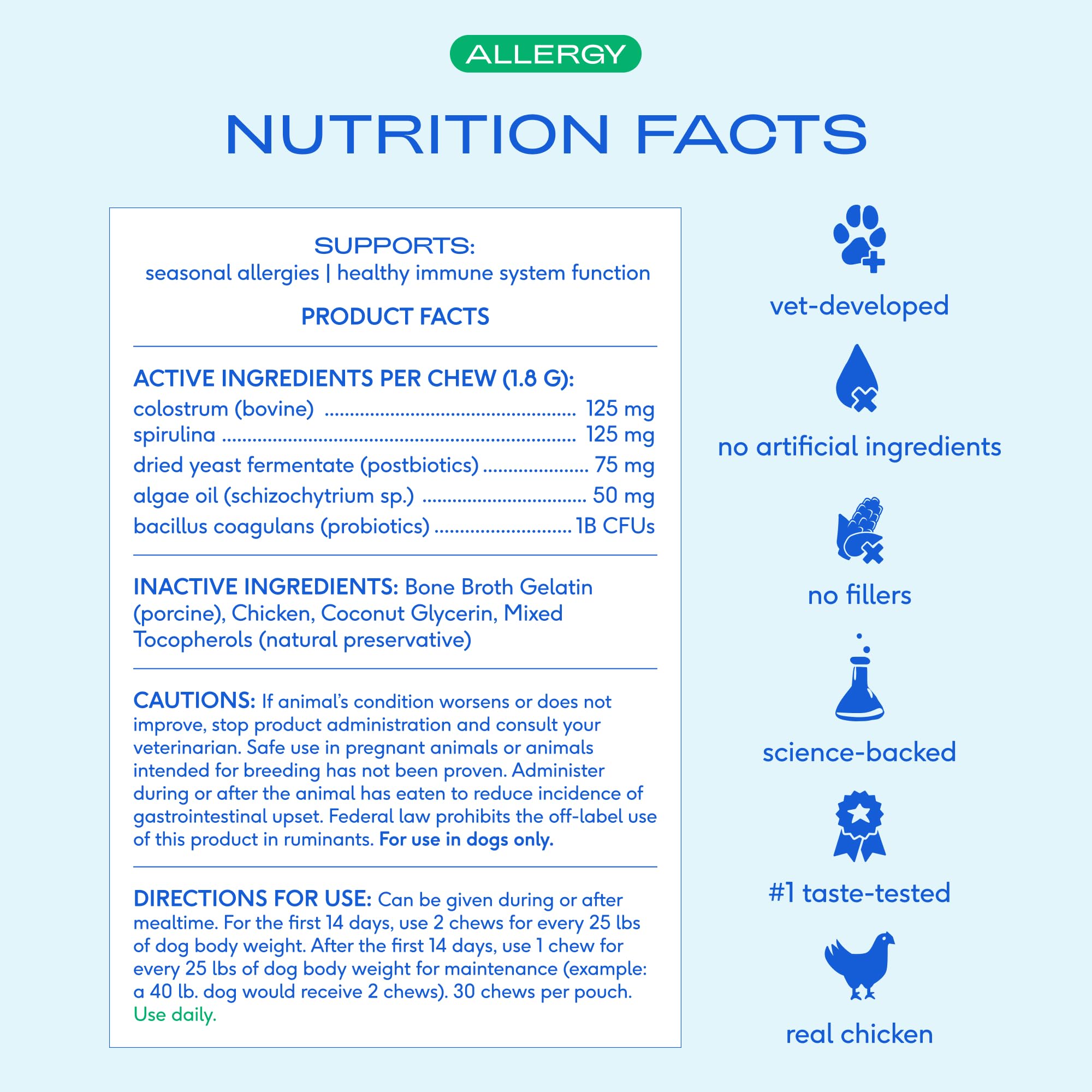 • REAL CHICKEN, NO ARTIFICIAL FLAVORS: These dog allergy relief chews are made with real chicken and no junk. Just clean, purposeful ingredients for effective dog seasonal allergy relief your pup will love, no fillers, no fluff, just results.