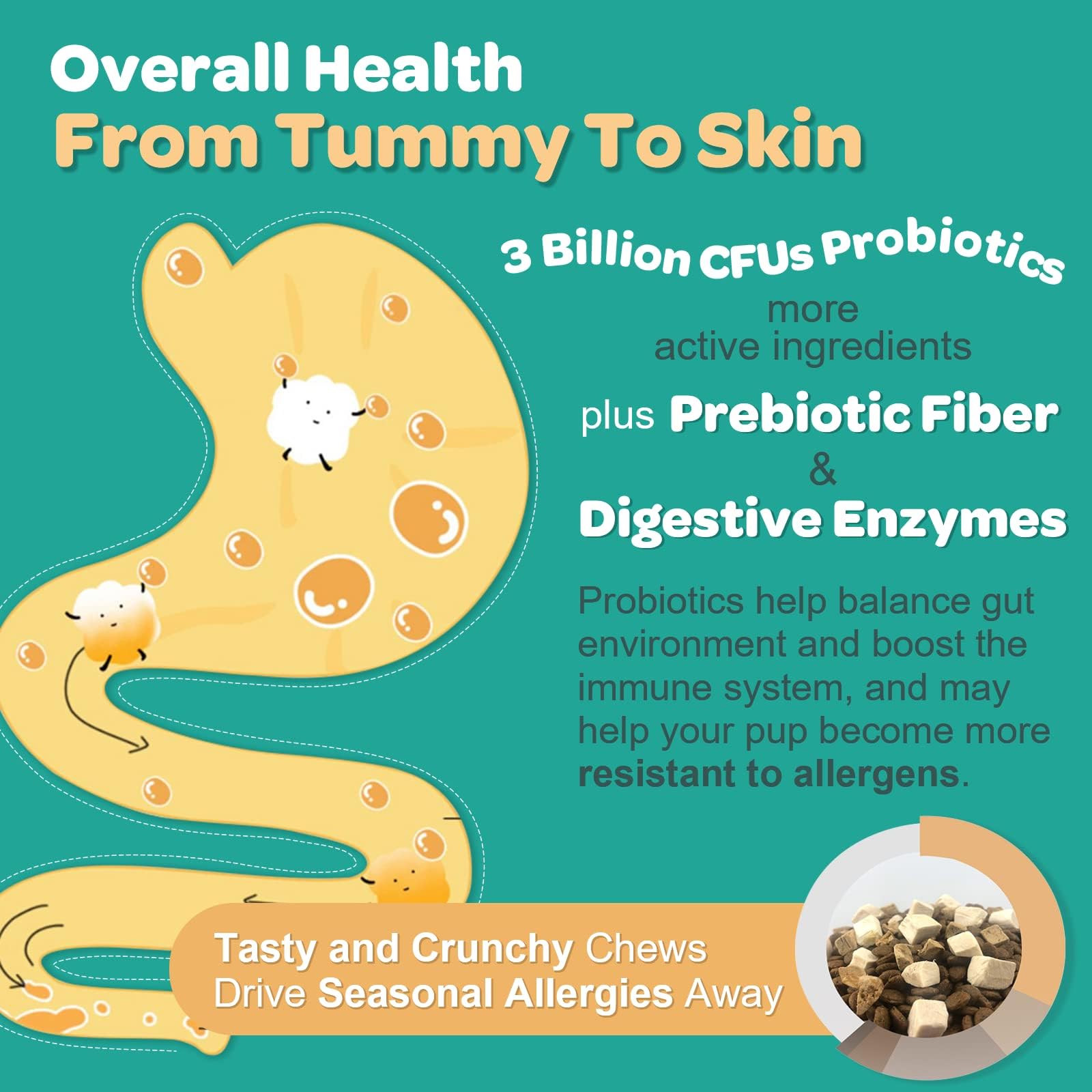 - STRONG IMMUNITY MORE RESISTANT TO ALLERGENS: Fortified with Colostrum, 3 Billion Probiotics and Digestive Enzymes, it helps build a healthy immune system. Probiotics for dogs, along with enzyme blend can improve digestive health, balance their gut flora and increase immunity defense, and help your pup become more resistant to allergens. The PRP&antibodies in colostrum help regulate immune response, moderate allergic reaction and make your dog in peak condition by promoting nutrient absorption