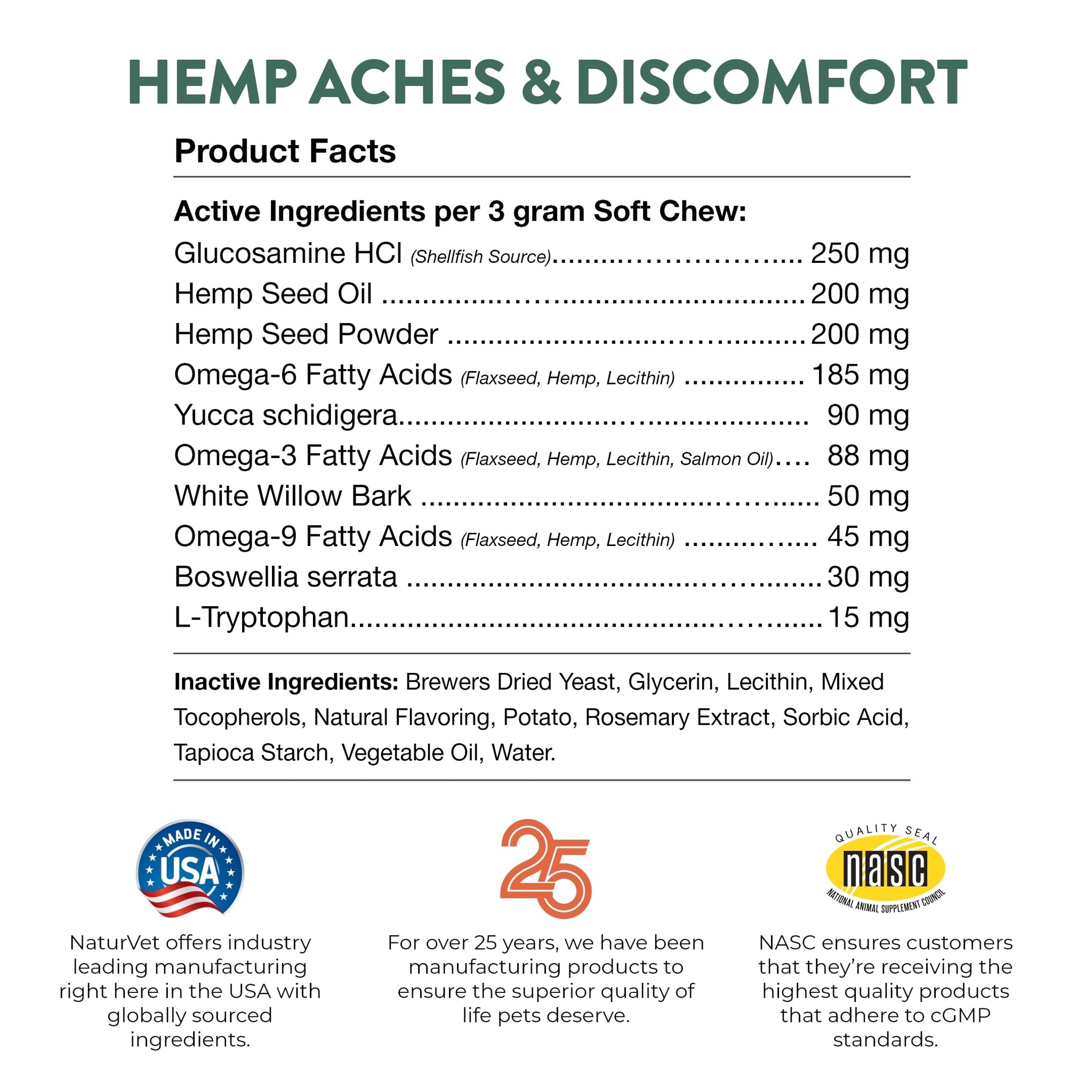 - INGREDIENTS THAT WORK – Formulated with Hemp Seed, Yucca schidigera, and Glucosamine for dogs. Glucosamine supports joint health and function while Hemp Seed helps alleviate aches and discomfort associated with normal daily exercise.