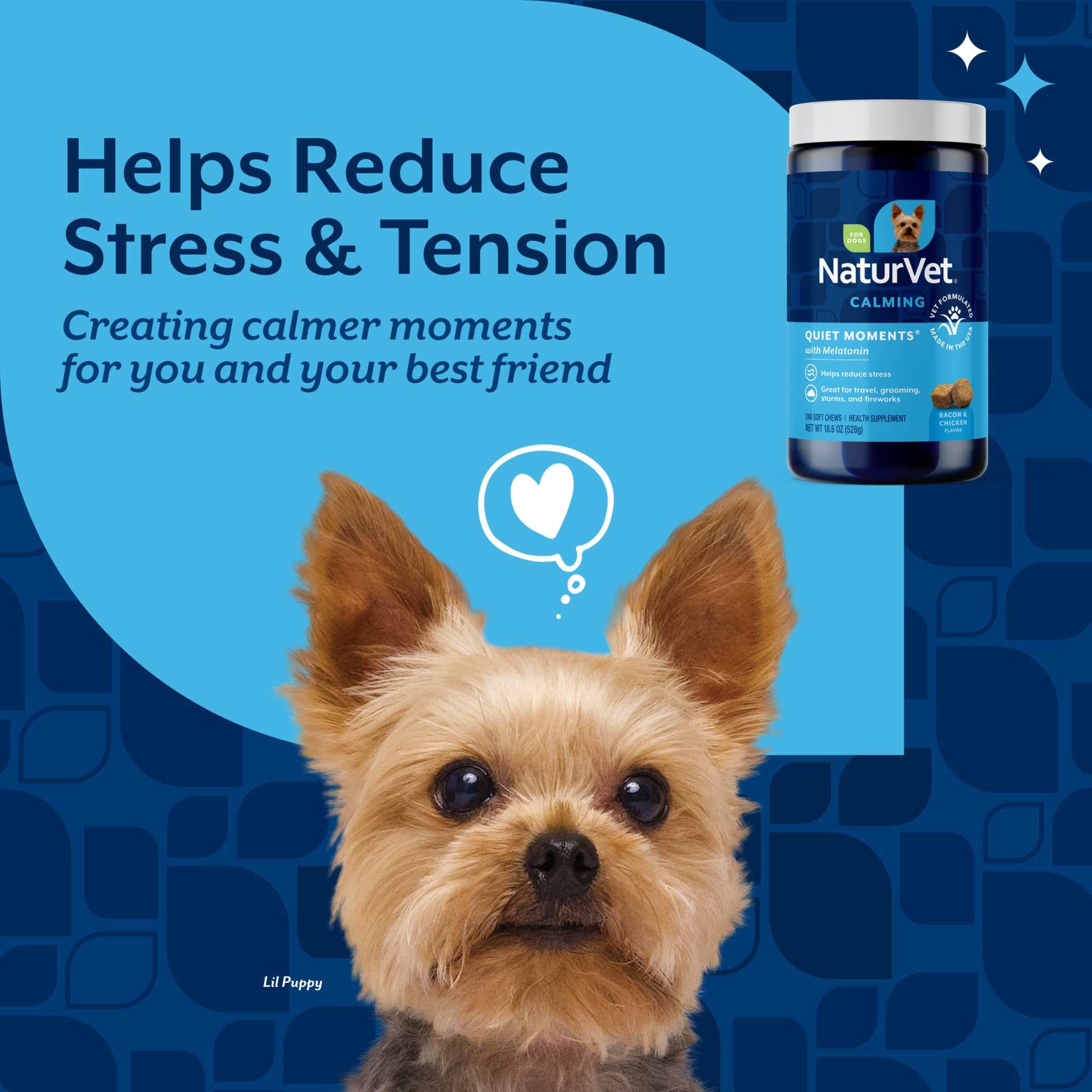 - Dog Stress Help: Whether you’re taking your rambunctious pup to the vet, your senior dog doesn’t travel well, or you have a canine who gets startled by fireworks and storms, our soft chew supplements for dogs can help reduce stress and tension