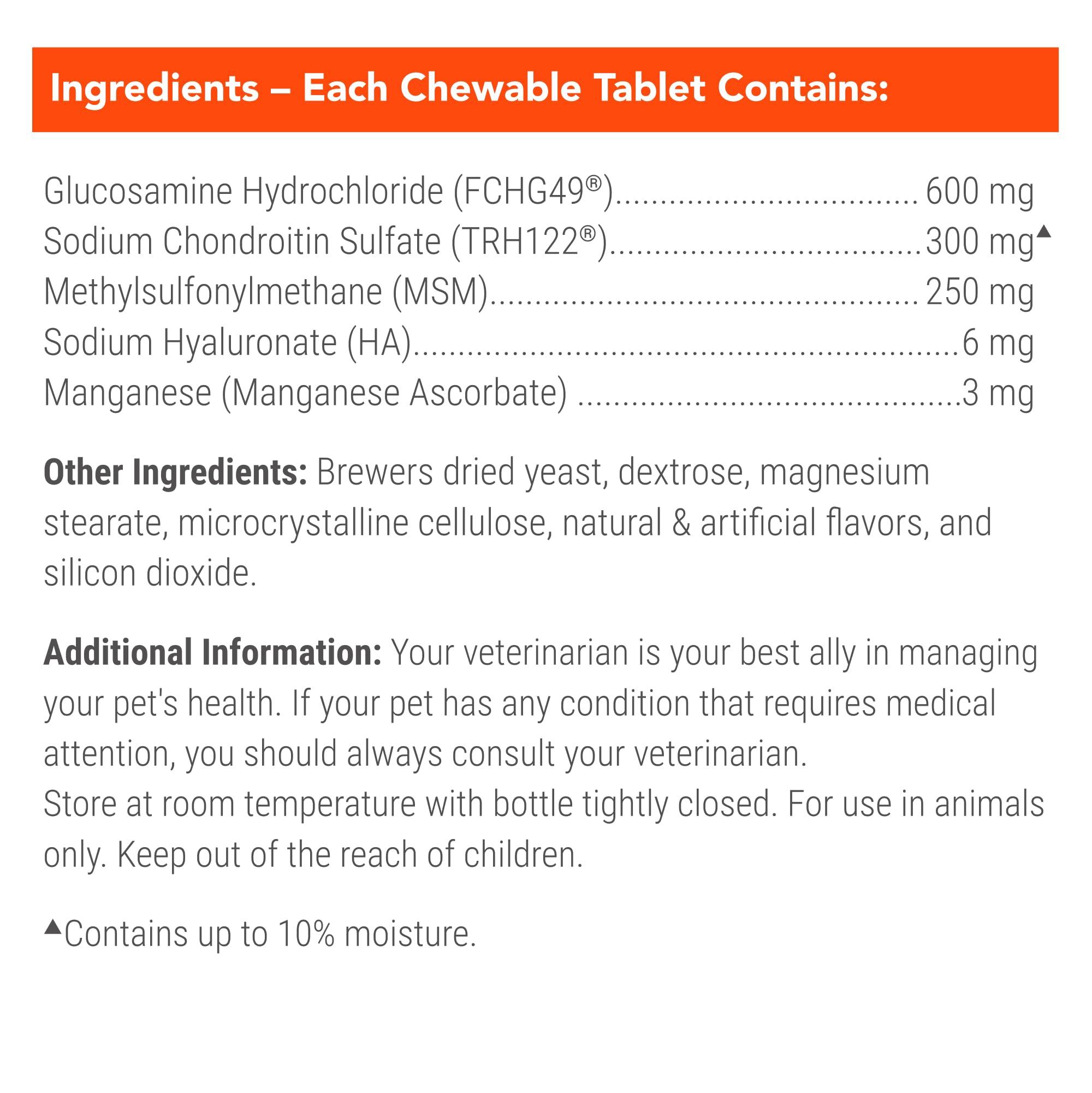 - With Hyaluronic Acid - Each chewable tablet also contains Hyaluronic Acid (HA), a major component of joint fluid, which helps keep joints moving smoothly.