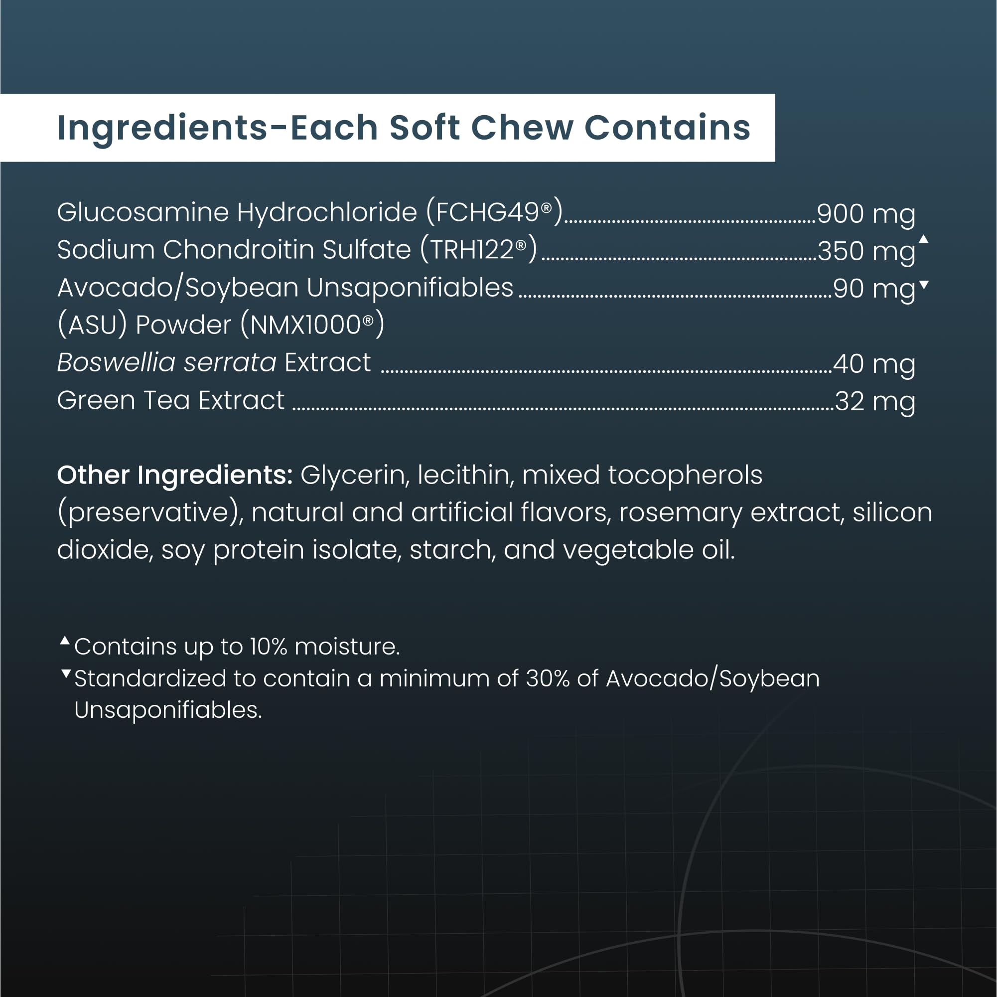 - Patented Formula - With a unique combination that contains glucosamine hydrochloride (FCHG49), sodium chondroitin sulfate (TRH122), ASU (NMX1000), Boswellia serrata extract, and green tea extract, Dasuquin helps support your dog’s joint health.