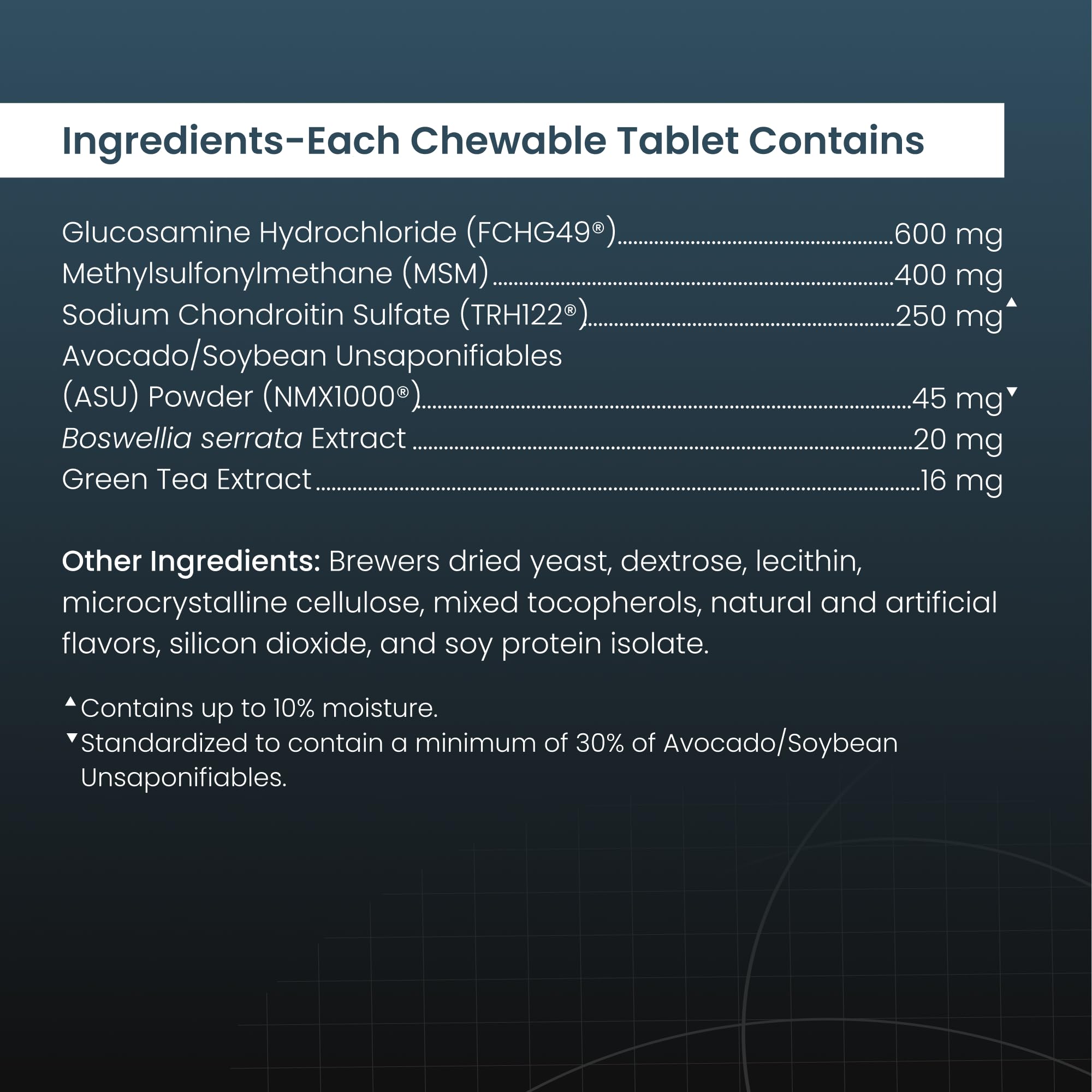Details: Dasuquin is the number one veterinarian recommended joint health brand that goes beyond standard glucosamine supplements. Dasuquin combines NMX1000 ASU(avocado/soybean unsaponifiables) and decaffeinated tea with Glucosamine and sodium chondroitin sulfate to provide a comprehensive joint health formula. MSM (methylsulfonylmethane), a source of sulfur used to support cartilage, adds to the multi-prong approach to joint health support. Research has shown that its specific glucosamine hydrochloride and low molecular weight chondroitin sulfate have demonstrated synergy in stimulating cartilage matrix production, while ASU also acts synergistically with glucosamine and chondroitin sulfate. Dasuquin with MSM chewable tablets provide a tasty and convenient option for supporting your dog’s joint health!" Source: Among veterinary brands. Survey conducted among small animal veterinarians who recommended oral joint health supplements brands in US.