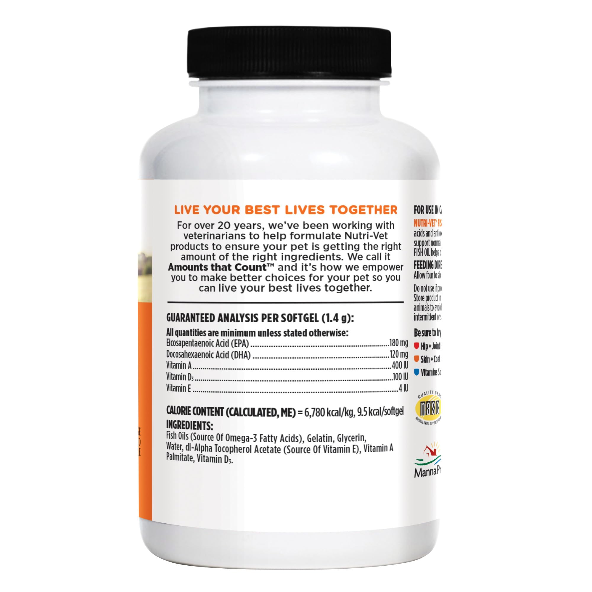 Details: Nutri-Vet Fish Oil Soft Gels provide the most convenient and effective way to give your dog the essential nutrients they need to support skin and coat health. Formulated as a tasty treat, these soft gels contain 300mg of Omega-3 fatty acids, including EPA and DHA, along with Vitamins A, D, and E to help maintain a healthy coat and promote overall well-being. Whether you're looking for a supplement for your dog’s coat defense, skin and coat supplement, or itch relief for dogs, Nutri-Vet Fish Oil Soft Gels are the perfect choice. Our fish oil for dogs is specially designed to support dog skin and coat health while also boosting your pet’s immune system. Rich in Omega-3 fish oil, this supplement works to relieve itching, dry skin, and promotes a shiny coat. It’s an essential part of your dog’s daily health regimen, particularly for breeds prone to itchy skin, shedding, and dull coats. Nutri-Vet offers premium-quality dog supplements, including vitamins for dogs and skin and coat relief for dogs. Nutri-Vet Fish Oil Soft Gels are easy to give and formulated with high palatability to ensure your dog enjoys their daily dose of health-boosting Omega-3 fatty acids. Perfect for pets that need Omega-3 fish oil or want to improve their coat health, these supplements are designed to make a difference in your dog’s overall wellness. Whether you need Omega 3 DHA, Omega 3 fish oil for dogs, or essential vitamins for dogs, Nutri-Vet has you covered with our comprehensive line of dog health supplies and dog must-haves. Promote your dog’s health and vitality with Nutri-Vet Fish Oil Soft Gels, a trusted supplement for pet owners who want the best for their furry companions.
