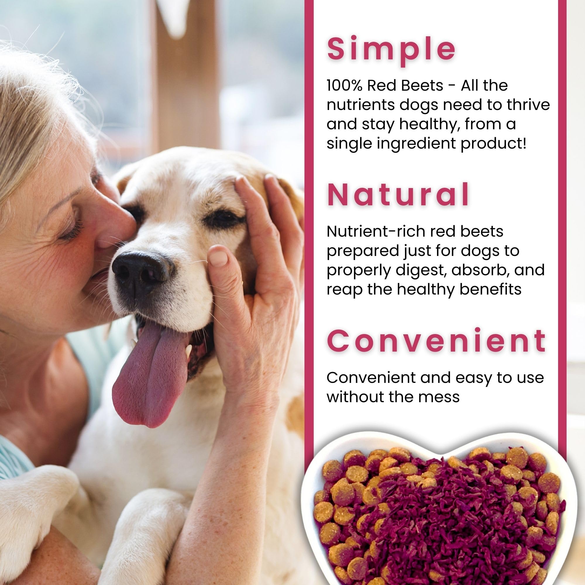 - SKIN & COAT SUPPORT: A nutritional powerhouse, red beets can help ease skin and coat troubles to keep dogs from itching and scratching. Our red beets can help address the most common root causes of dog itching from the inside by promoting gut health for dogs and providing immune, cleansing, and nutritional support. It’s a natural dog skin and coat supplement and dog shedding supplement that provides benefits beyond salmon oil for dogs, omega 3 for dogs and fish oil for dogs skin and coat.