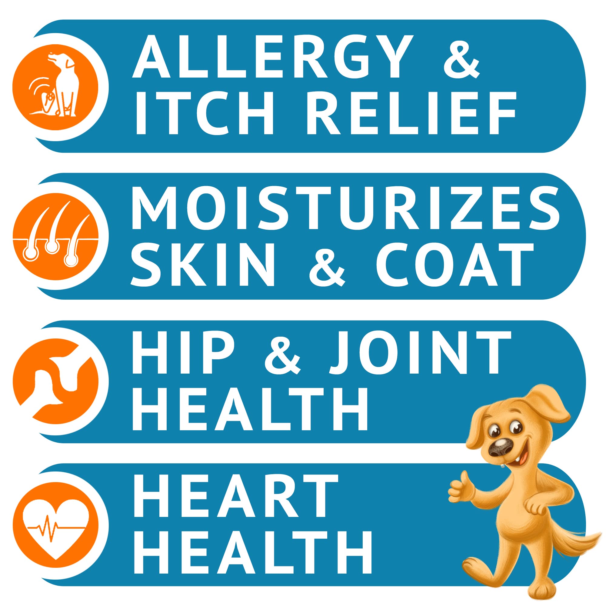 - Premium Omega Fish Oil for Dogs in Bites Form: Our U.S. made chewables enriched with fatty acids, DHA, and EPA are the best in pet skincare. These salmon oil for dogs skin and coat bites are an advanced, odorless remedy for dry skin and dandruff.