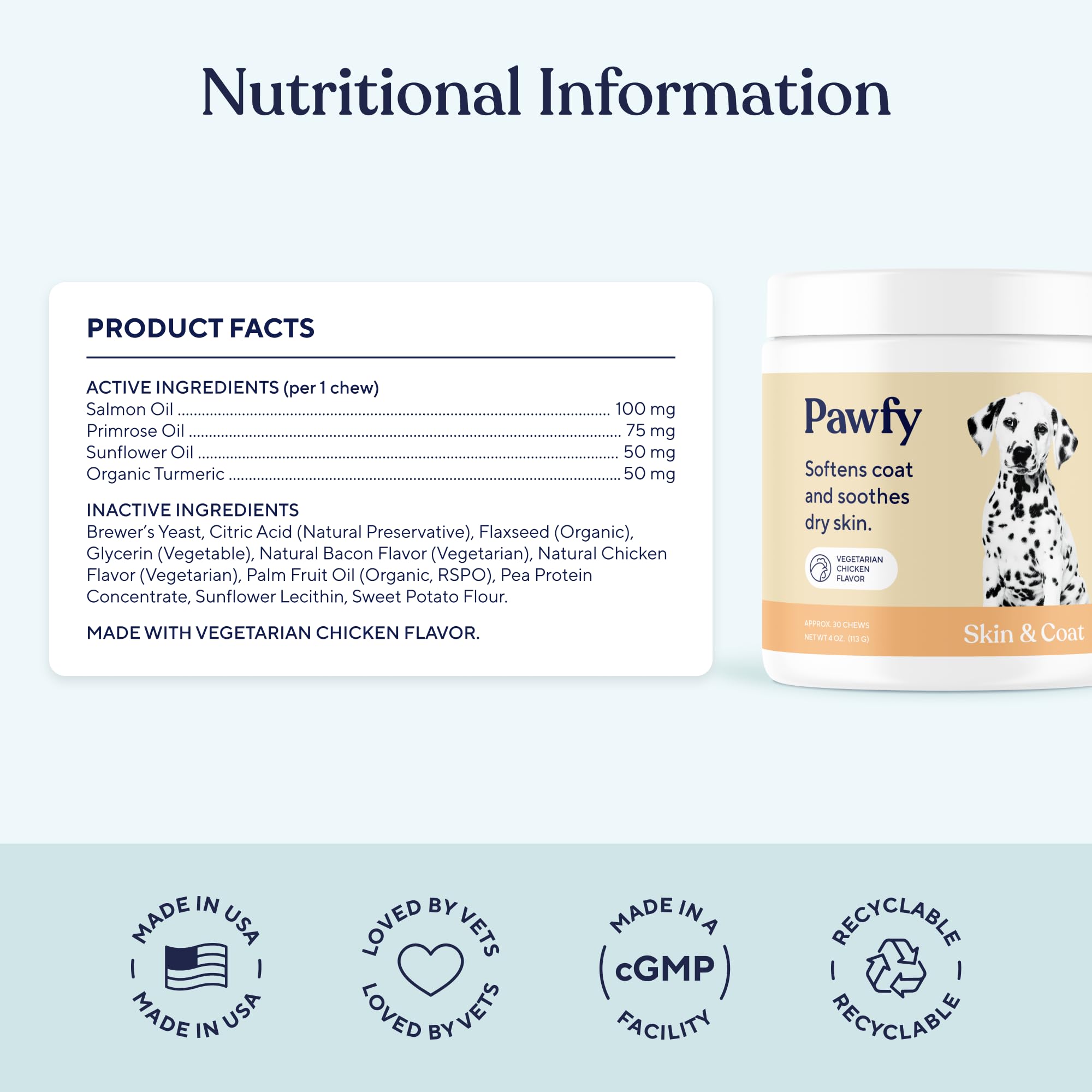 - Boosts Coat Health: Support your dog’s skin and coat with our nutrient-packed chews. Formulated as a skin and coat supplement, these chews promote a shinier, healthier coat while helping to maintain skin hydration and comfort, reducing the chance of occasional dryness and irritation.