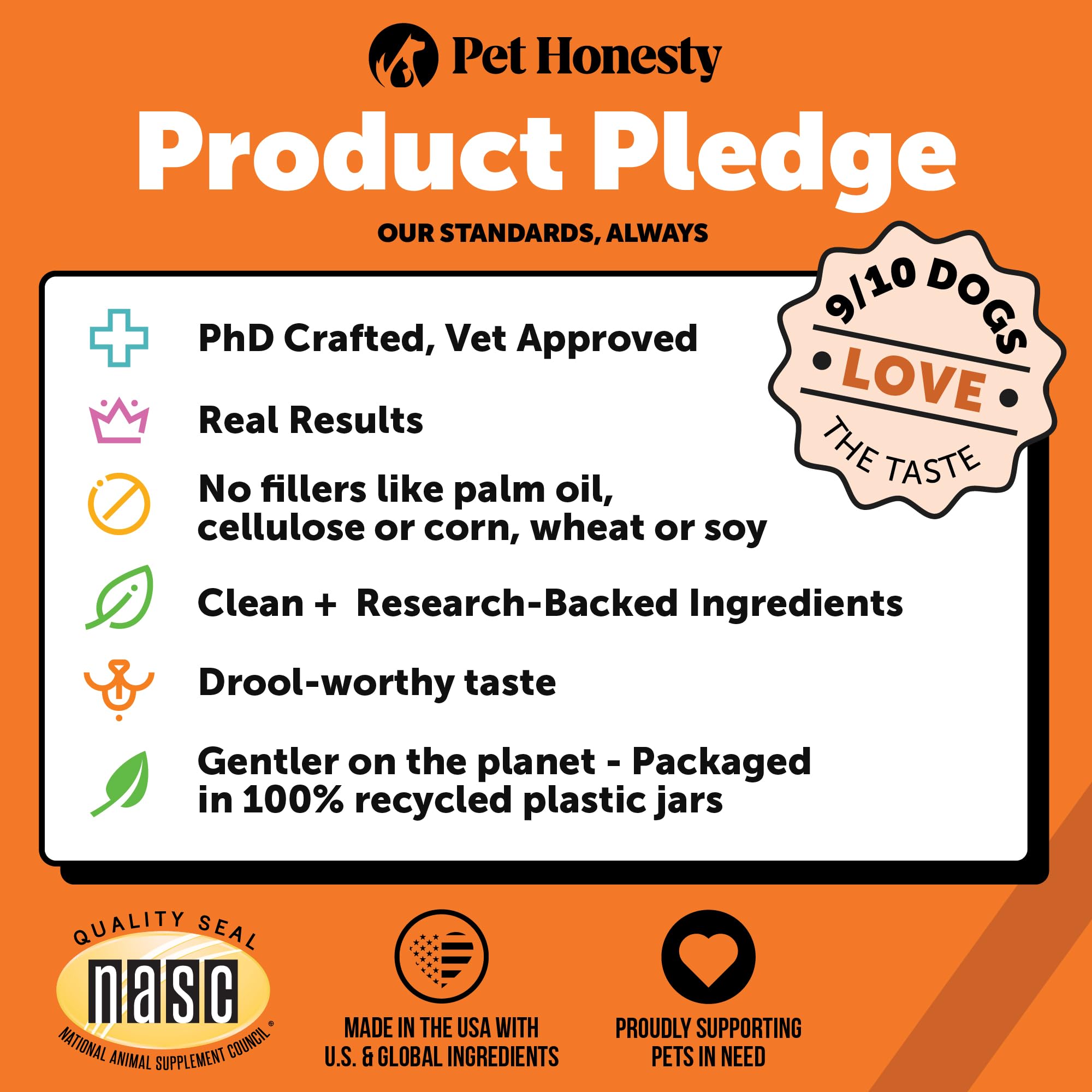 • THE HONEST DIFFERENCE: Pet Honesty products are made with clean, science-backed ingredients you can trust. Our dog supplements for joint and mobility contain no corn, wheat, soy, artificial preservatives, colors, or flavors. Proudly made in the USA in a GMP-compliant facility and backed by NASC membership for quality and safety.