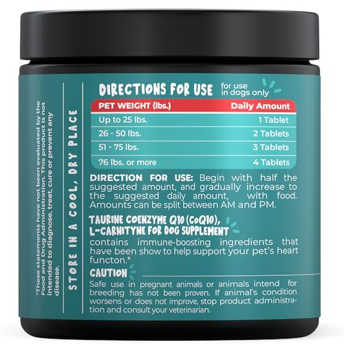 - HEALTHY HEART: As amino acids, taurine and L-carnitine strengthen a canine's most important muscle: its heart. By supplementing your dog's diet with a boost of taurine and L-carnitine, its blood can flow efficiently and reduce the risks of disease, dilated cardiomyopathy (DCM), congestive heart failure (CHF), heart murmurs, arrhythmia and other heart conditions.Taurine supplementation is recommended by vets for dogs suffering from taurine deficiency and heart diaseas.*