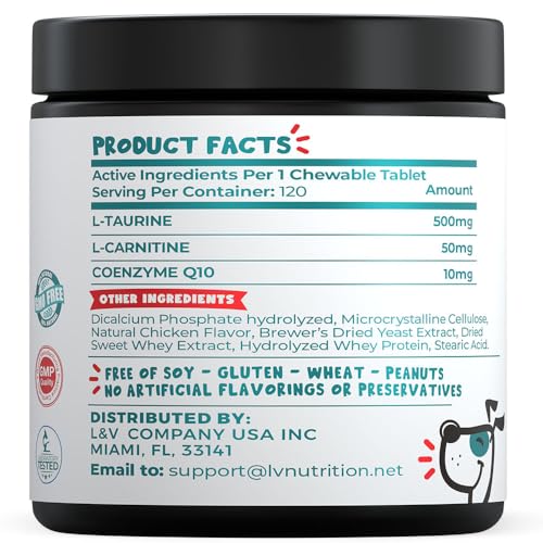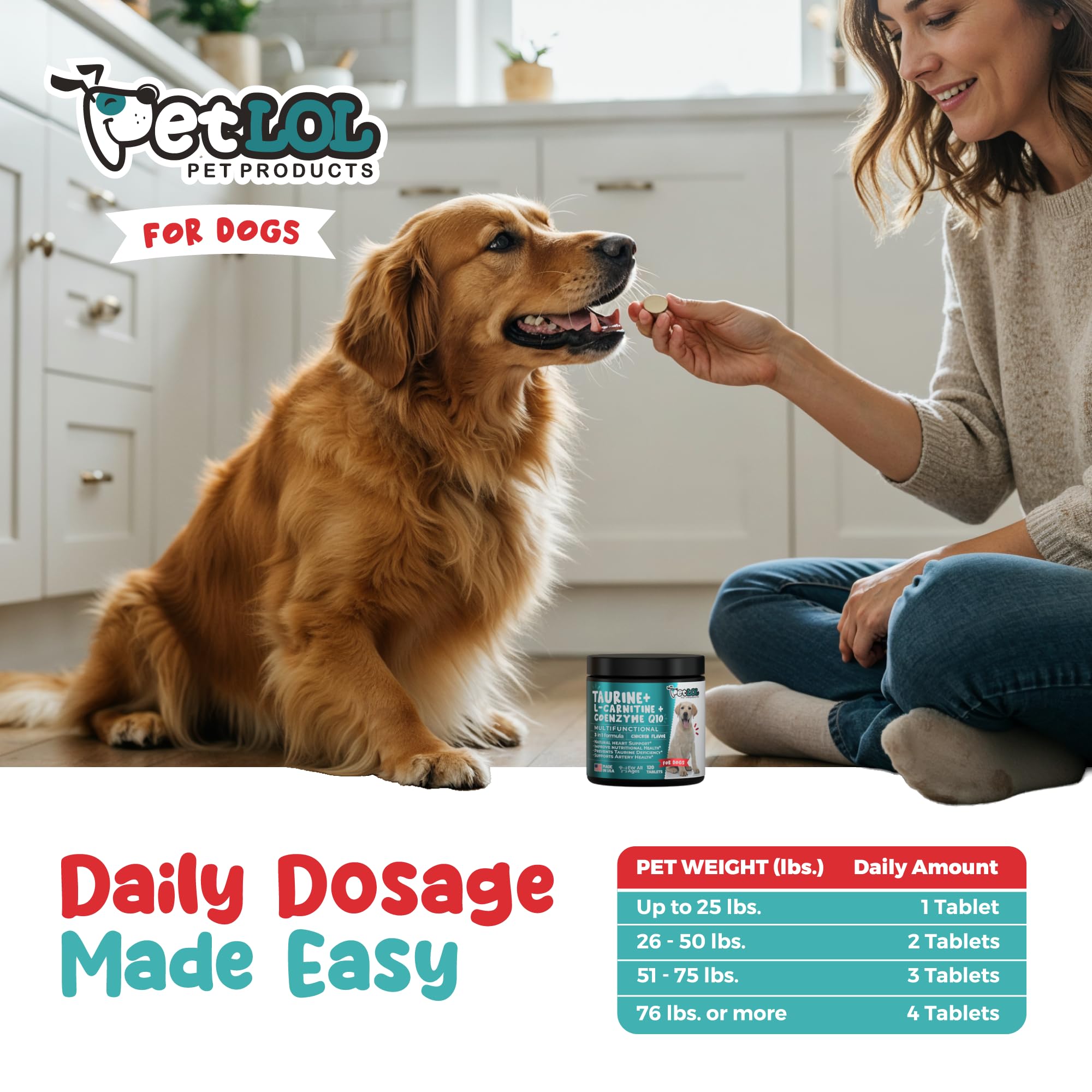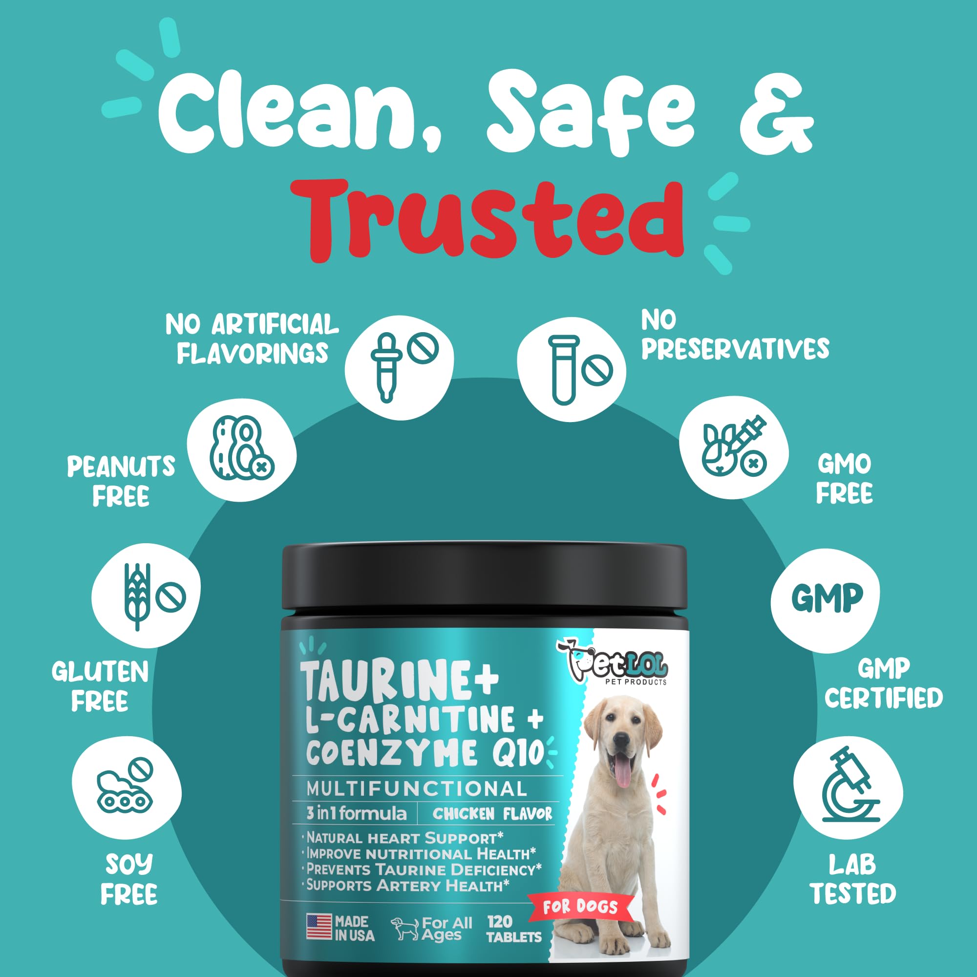 - POWERHOUSE 3-IN-1 FORMULA: Uplift your dog's health with our 500mg taurine, 50mg L-carnitine and 10mg CoQ10 supplement for enhanced heart, brain, liver and kidney support while promoting elevated energy levels and immune function to help your good boy or girl live a long, healthy and happy life.