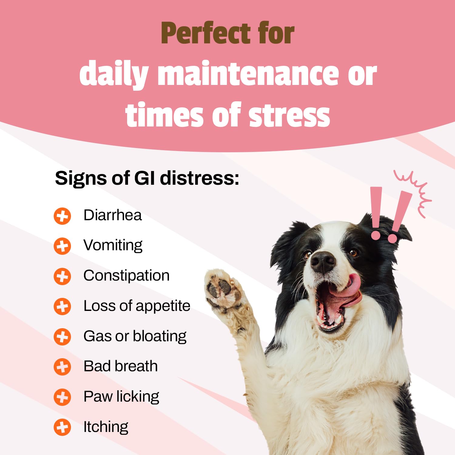 - Dog probiotics for digestive health: Combining 120 million CFUs of Bacillus coagulans and prebiotic fiber to help ease signs of GI distress like diarrhea, vomiting, constipation, bad breath, gas, bloating, itching and paw licking