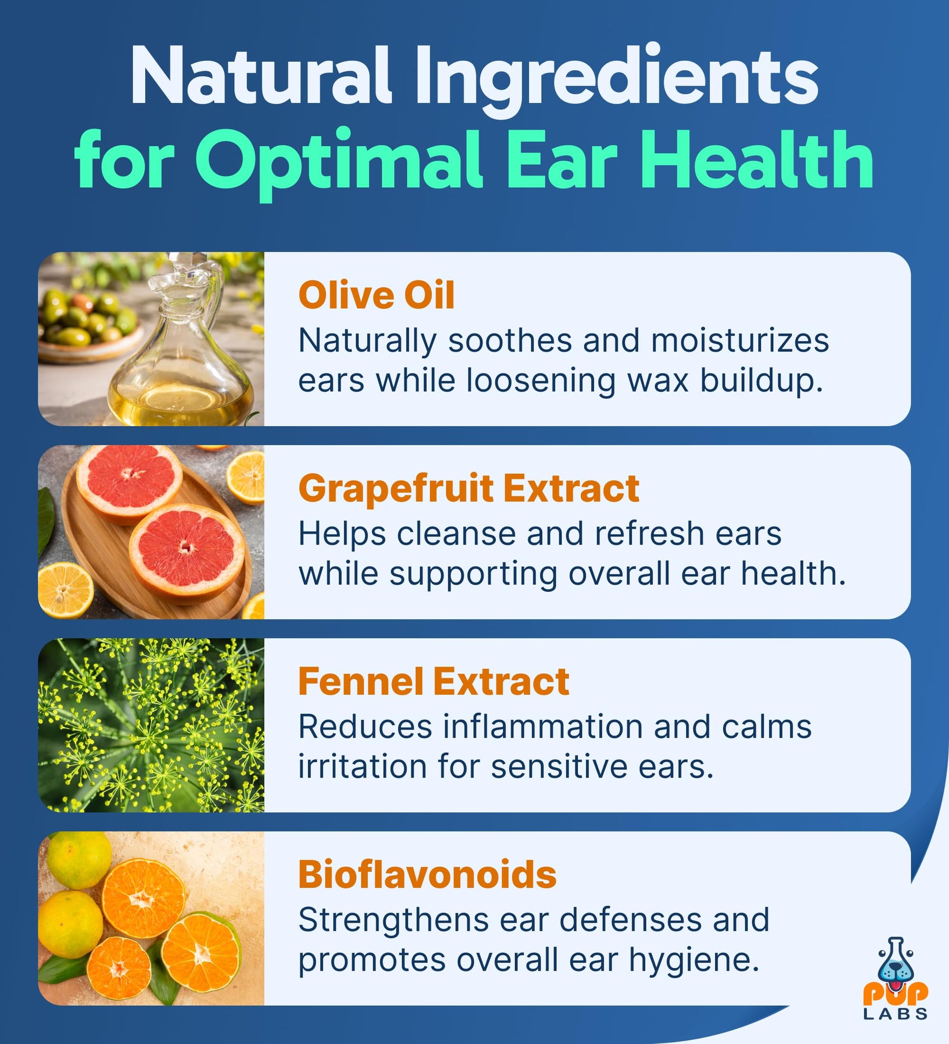 - Gentle, All-Natural Formula: Pup Labs Ear Clear is an all-natural dog ear cleaning solution made with olive oil, grapefruit extract, fennel, and bioflavonoids. A non-stinging ear cleaner dog formula safe for regular use.