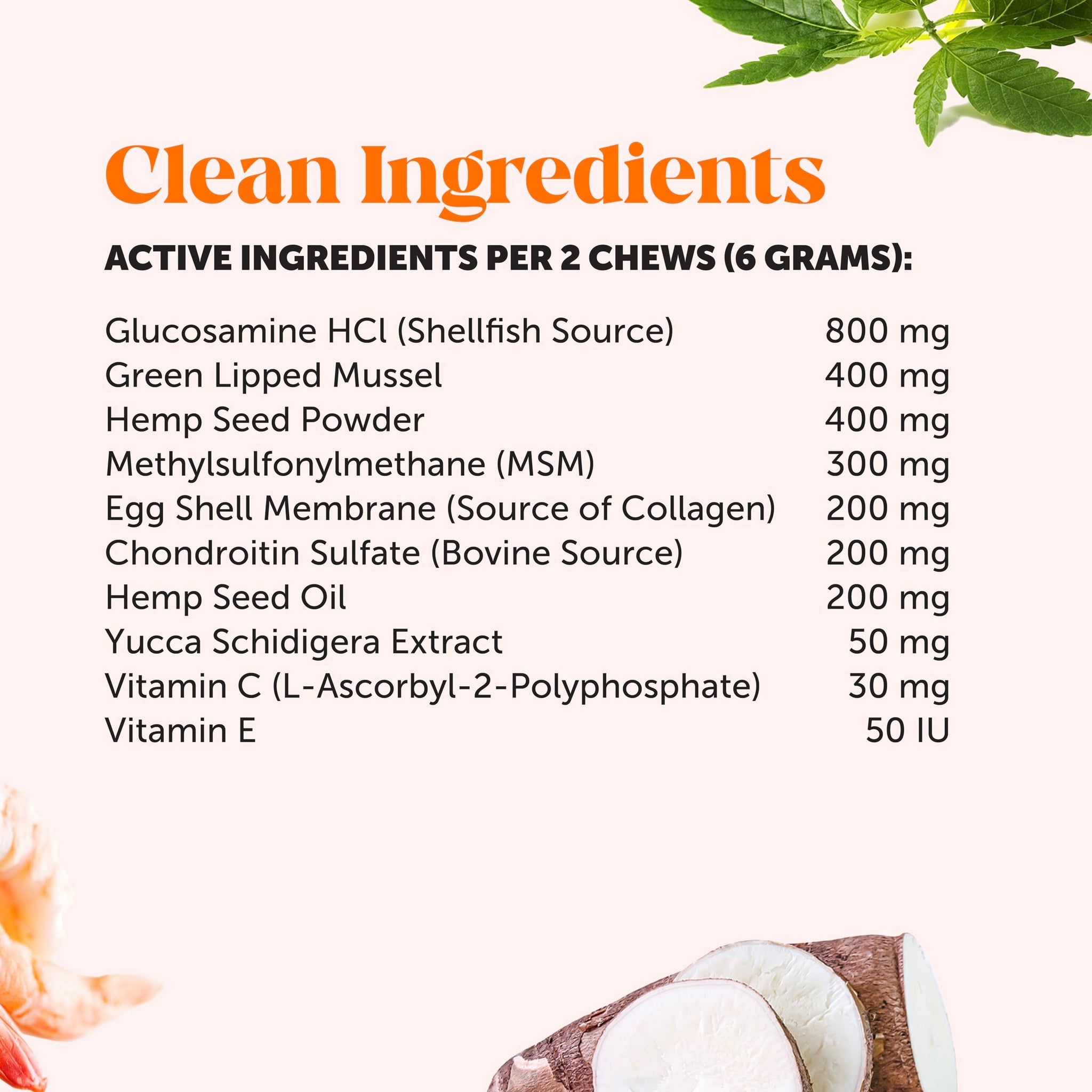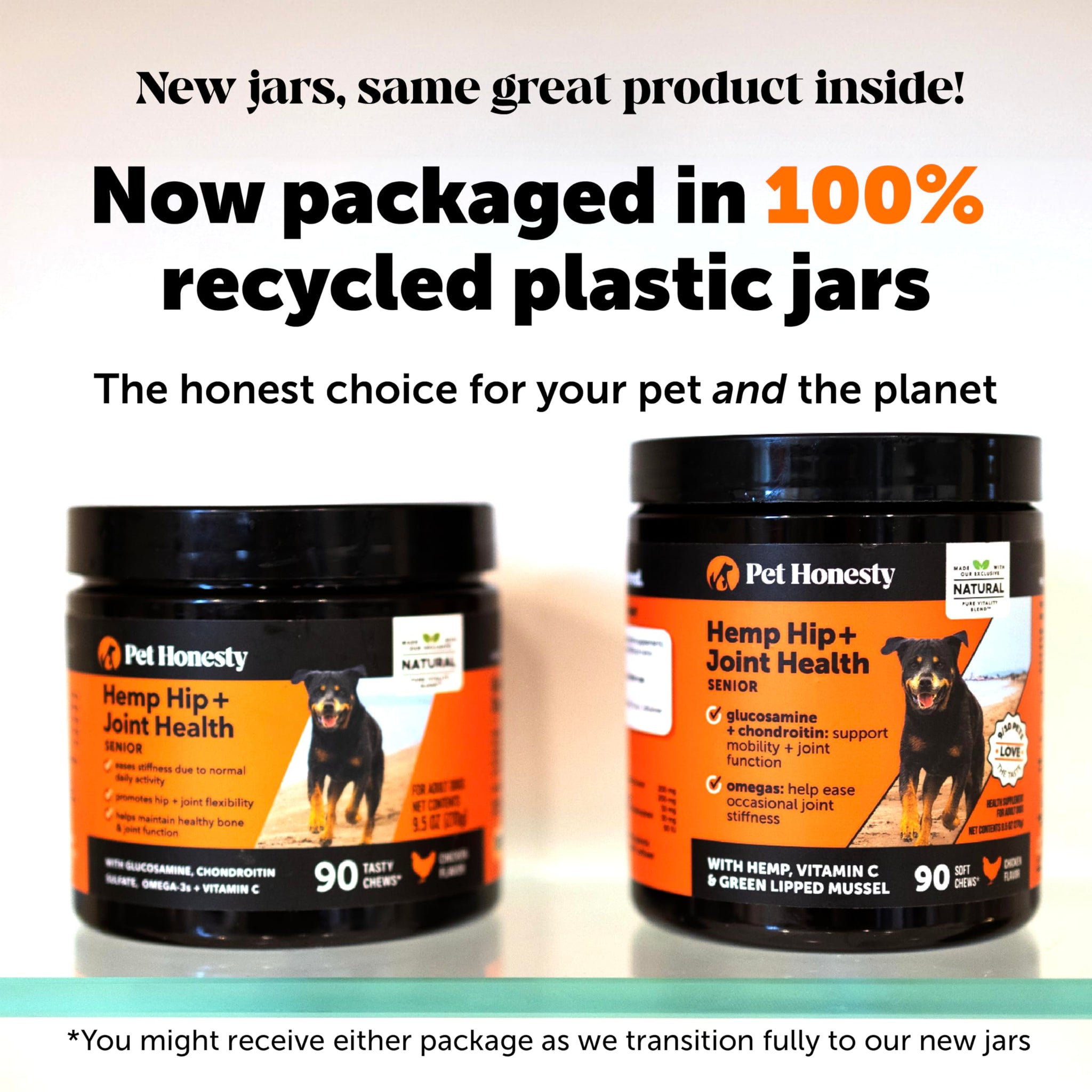 - Extra-strength senior formula with natural ingredients - Pet Honesty is committed to quality ingredients and strict safety standards. Our Senior Hemp Mobility chews contain natural ingredients like glucosamine HCL, MSM, turmeric, green-lipped mussel, and organic hemp oil to form a vet-recommended, extra-strength formulation.