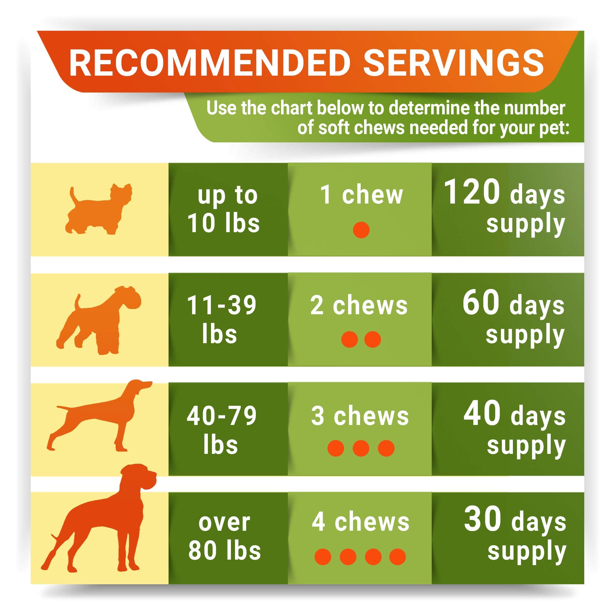 • 120 Joint Health Chews per Jar - one jar of our dog joint supplement chews will provide 1 to 4 month snacks supply depending on your dog’s size. (See chart for your reference)