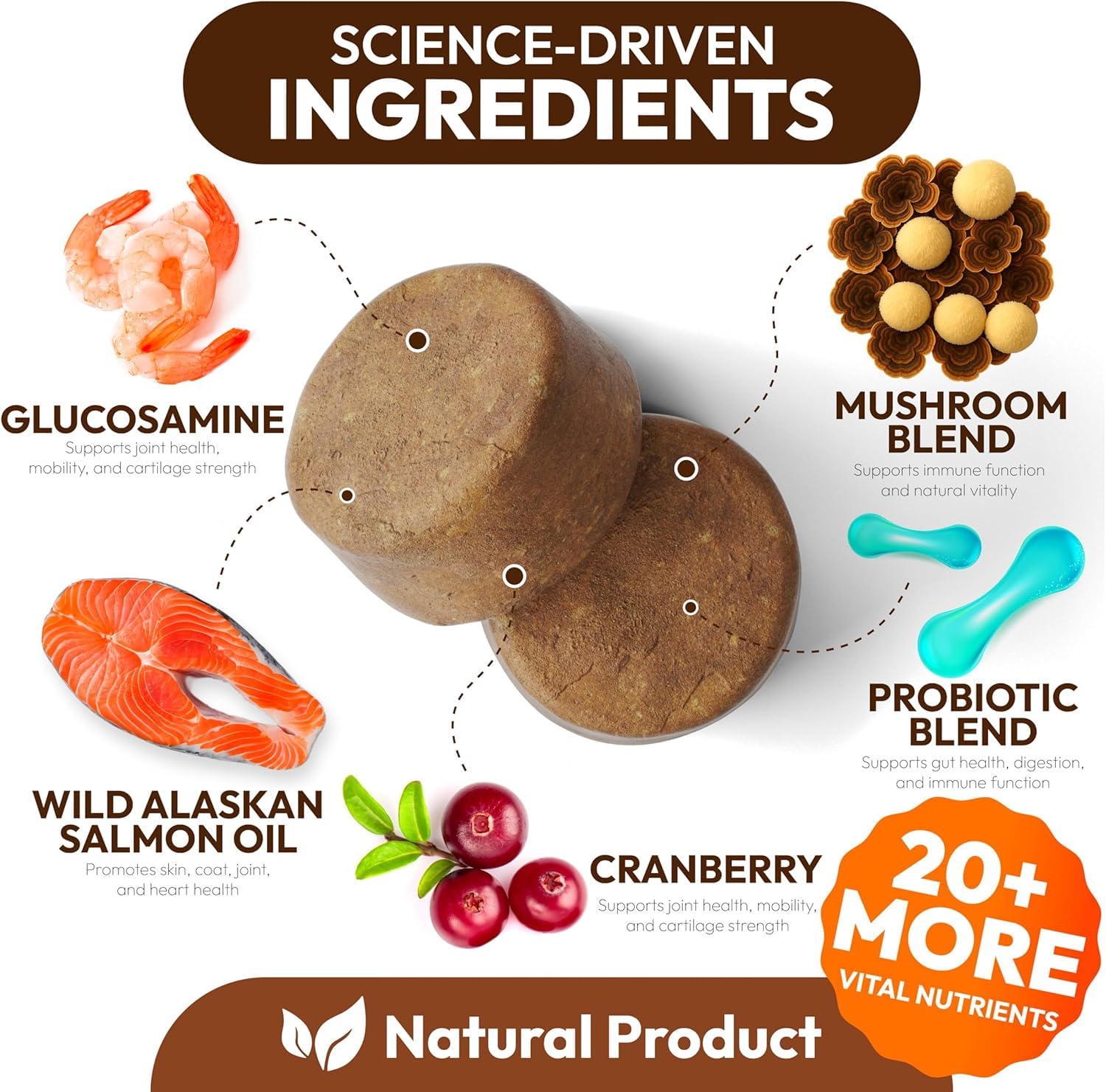 • Premium and Natural Ingredients Formulated by Veterinarians: Carefully crafted with 7 functional mushrooms, glucosamine, and superfoods—no sugar, wheat, corn, or GMOs—just pure wellness support.