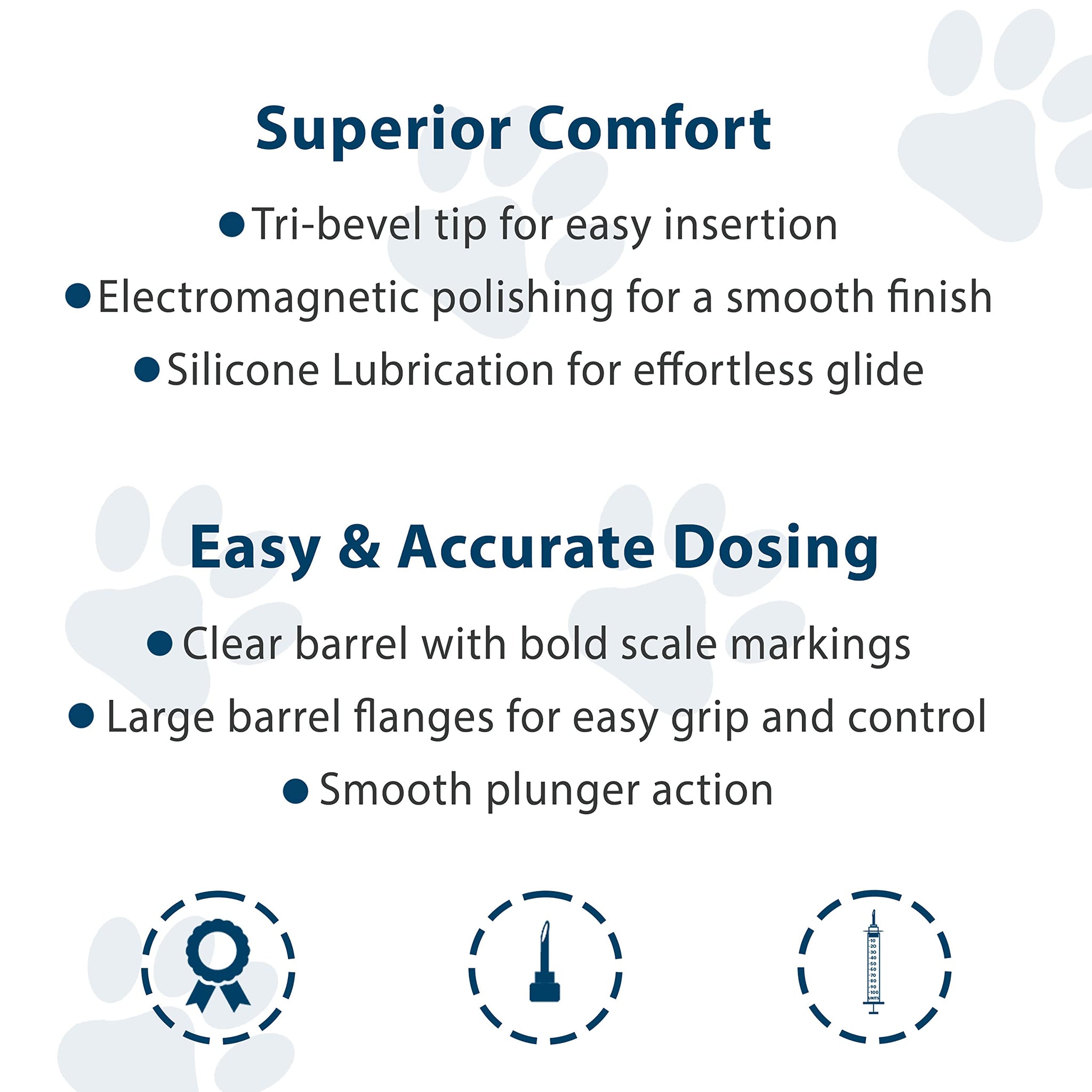 - PREMIUM QUALITY INSULIN SYRINGES: Provide a triple bevel electromagnetic polished, silicone coated needle with bold barrel markings and large barrel flanges for accurate dosing and easy grip and control. FOR ANIMAL USE ONLY.