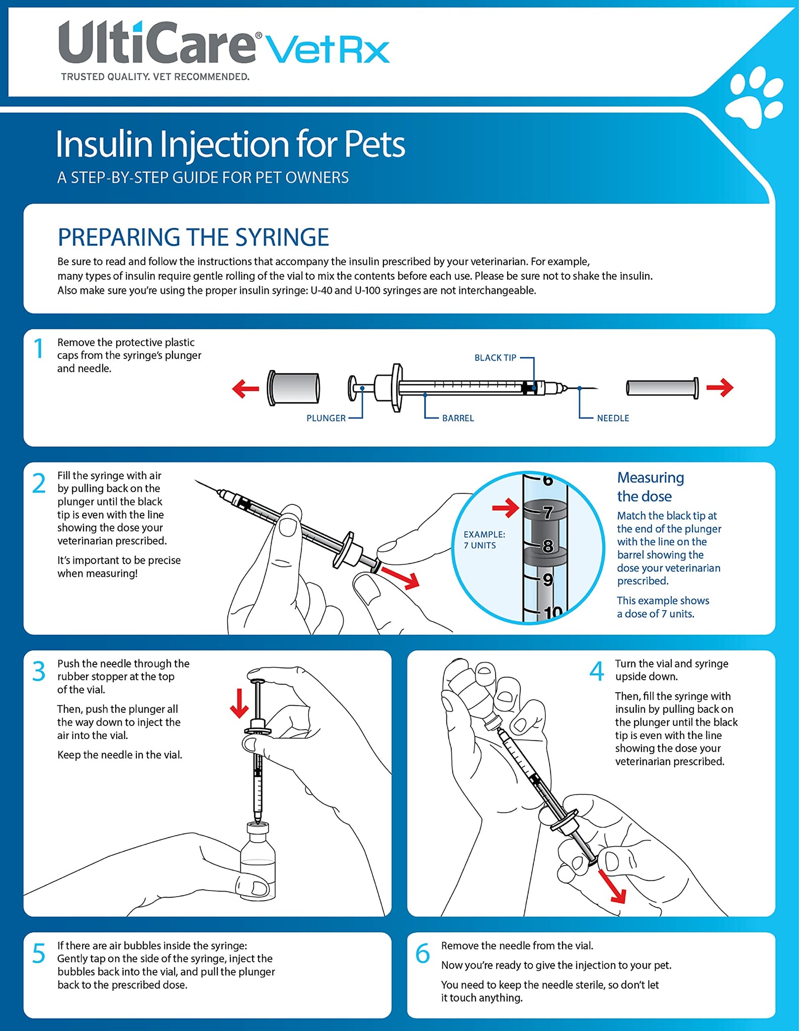 - 100 PET INSULIN SYRINGES: One box contains 100 single use 3/10cc human-grade U-100 insulin syringes with highly polished and silicone coated ½” needles.