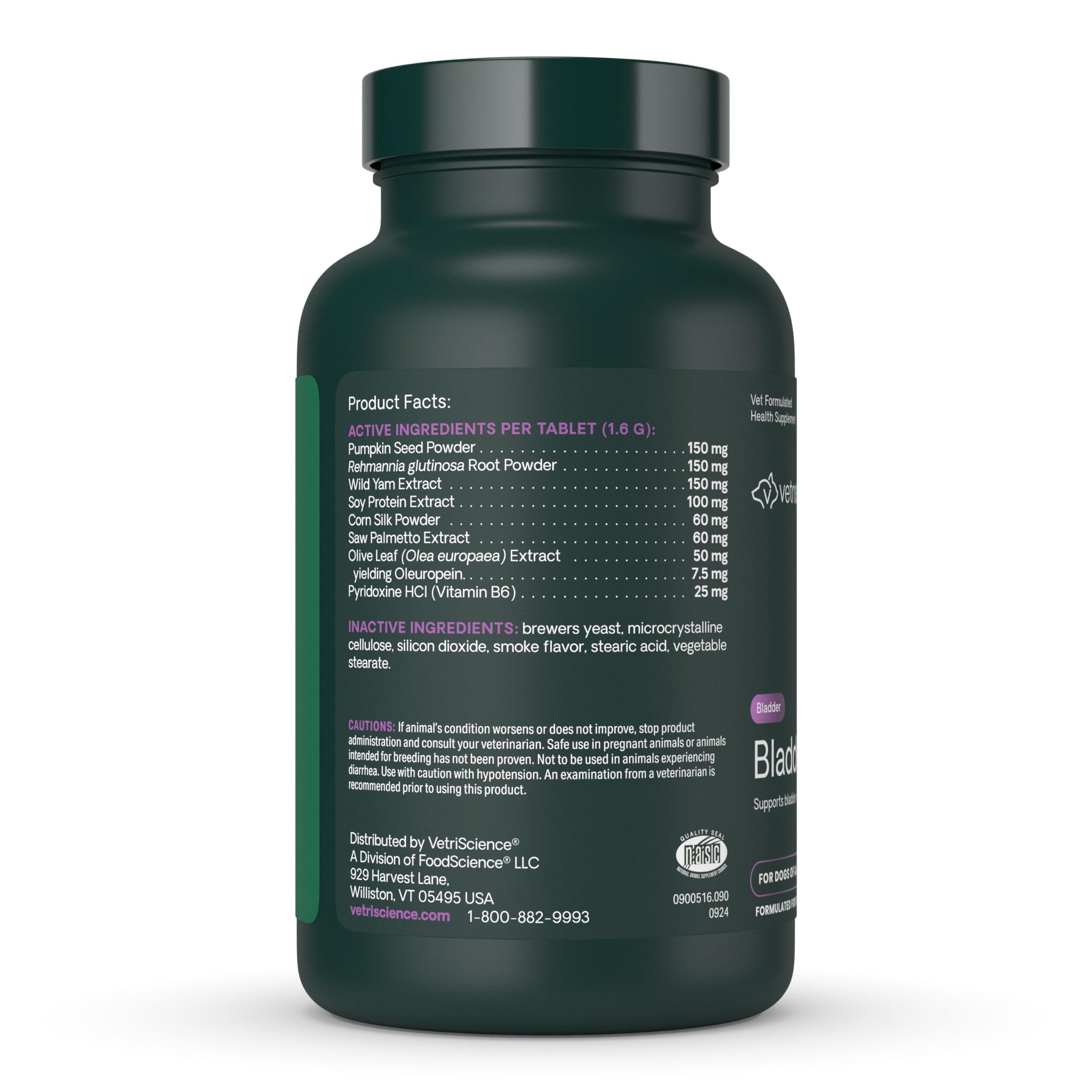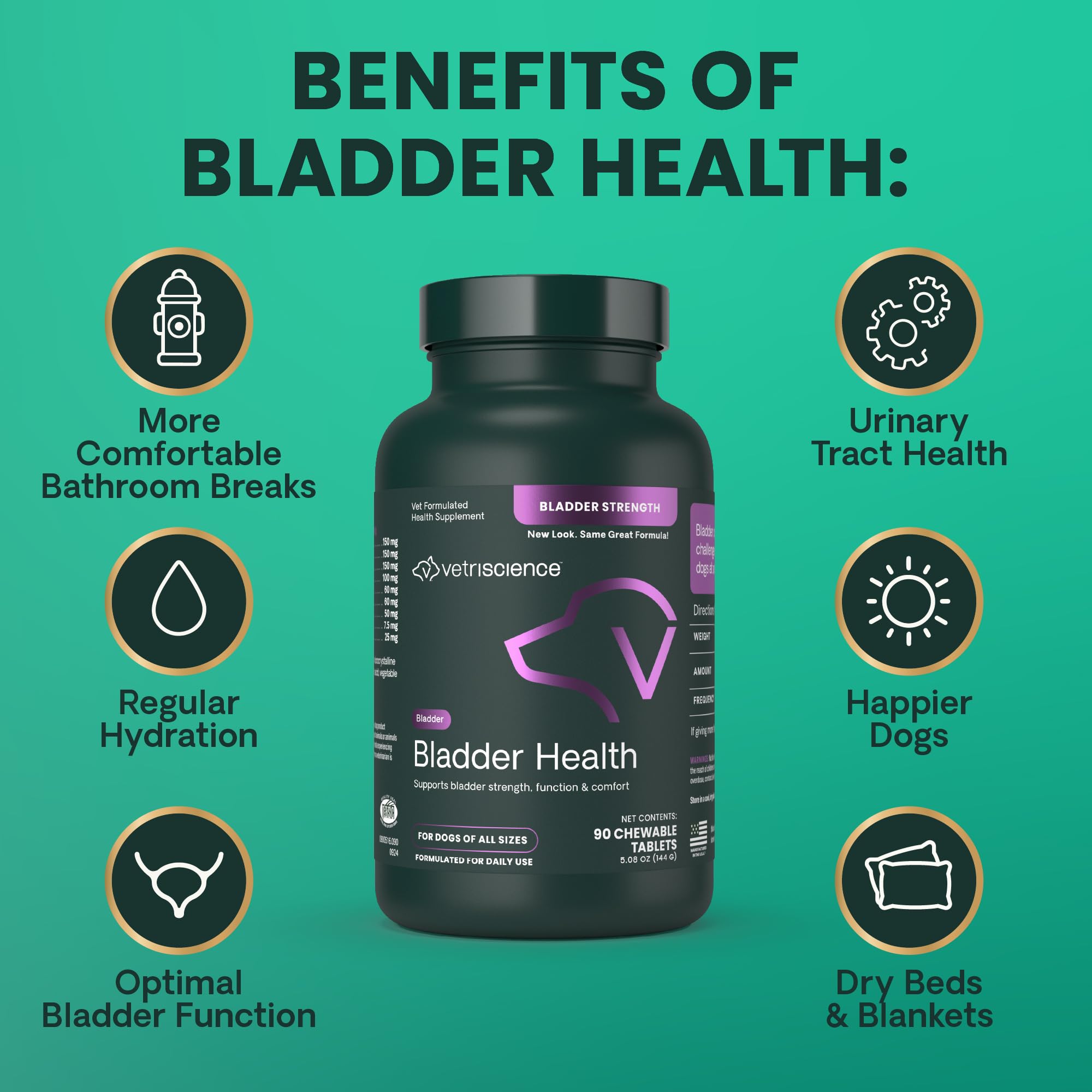 Details: Support your dog’s urinary tract health and comfort with Bladder Health (new name, same great Bladder Strength formula), a vet-formulated, non-hormonal bladder support supplement for dogs that experience incontinence from spaying or normal aging. This powerful blend encourages proper bladder function and reduced leakage, and features pumpkin seed to improve bladder control, saw palmetto for healthy muscle tone of the bladder, and wild yam for balanced urinary control. Isoflavones from soy protein help maintain normal bladder strength, while Rehmannia glutinosa supports healthy kidney function. Olive leaf, corn silk, and Vitamin B6 act as gentle diuretics, encouraging regular hydration and urination to help flush the urinary tract and maintain a healthy bacterial balance. Bladder Health is designed for all life stages but formulated with spayed and senior dogs in mind. This bladder control supplement for dogs targets key areas of the urinary system to promote comfort and control to help reduce leakage in dogs who experience incontinence or overactive bladders. Trust Bladder Health for comprehensive bladder control, backed by veterinary science for long-term urinary health. Our dog and cat supplements are certified by the National Animal Supplement Council (NASC), routinely undergo third-party testing, and contain no hidden ingredients, artificial flavors, synthetic colors or preservatives.