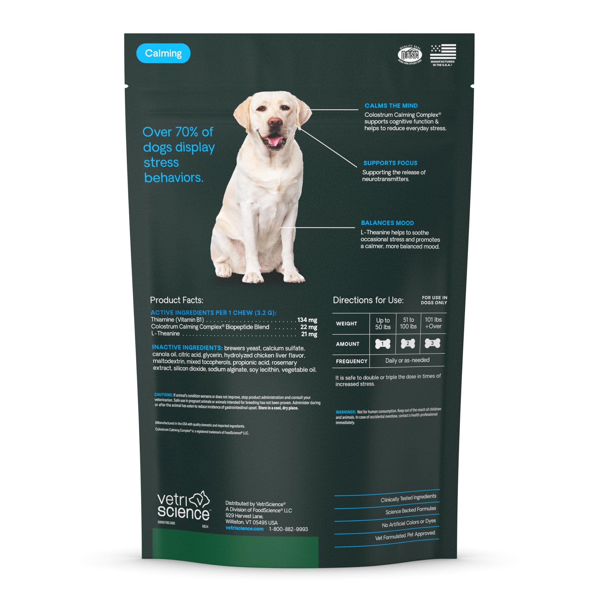 Details: Help remove the stress from your pup's life and transform their anxious behavior with VetriScience Calm & Confident. (New name, same great original Composure formula!) These delicious bite-sized chews are made in the USA and designed to help calm and soothe anxious and stressed-out dogs with naturally sourced ingredients. The colostrum blend not only helps to reduce stress, but it also supports your dog's cognitive function. The VetriScience Calm & Confident formula has been clinically tested and shown to work in just 30 minutes with results lasting up to four hours. Give the recommended number of chews to your dog before their next vet visit, during the next thunderstorm, or whenever they're in a stressful situation - you can even double or triple the dose if needed during periods of added stress. If your dog is showing signs of anxiety like excessive barking, destruction of household items, hiding, or separation anxiety, grab a bag today and see the results for yourself. Once dogs get a taste of the delicious flavor and scrumptious chewy texture, they'll be begging for more! Are you looking for the Golden Years Calm & Confident formula? Check out VetriScience Senior Calm & Confident.