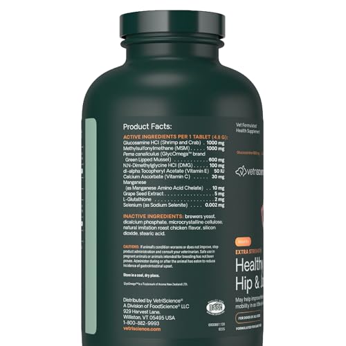 Details: VetriScience Extra Strength Healthy Hip & Joint (new name, same great GlycoFlex Stage 3 formula) is the perfect daily glucosamine joint supplement for young, highly active dogs and adult dogs needing moderate or advanced joint support and protection. This vet-formulated joint tablet for dogs is made with nutritious, science-backed ingredients like glucosamine and MSM, green-lipped mussel, and antioxidants to help cushion and lubricate joints and keep your dog flexible and comfortable during everyday activities that may put stress on the body. Pet parents typically report seeing positive effects within 4 weeks of starting their dog on the Extra Strength Healthy Hip & Joint formula. If your dog is starting to slow down or lose interest in their favorite household and outdoor activities, grab a bag of Extra Strength Healthy Hip & Joint today and see the results for yourself. Once dogs get a taste of the delicious flavor and crunchy texture, they'll be begging for more. Our dog and cat supplements are certified by the National Animal Supplement Council (NASC), routinely undergo third-party testing, and contain no hidden ingredients, artificial flavors, synthetic colors or preservatives.