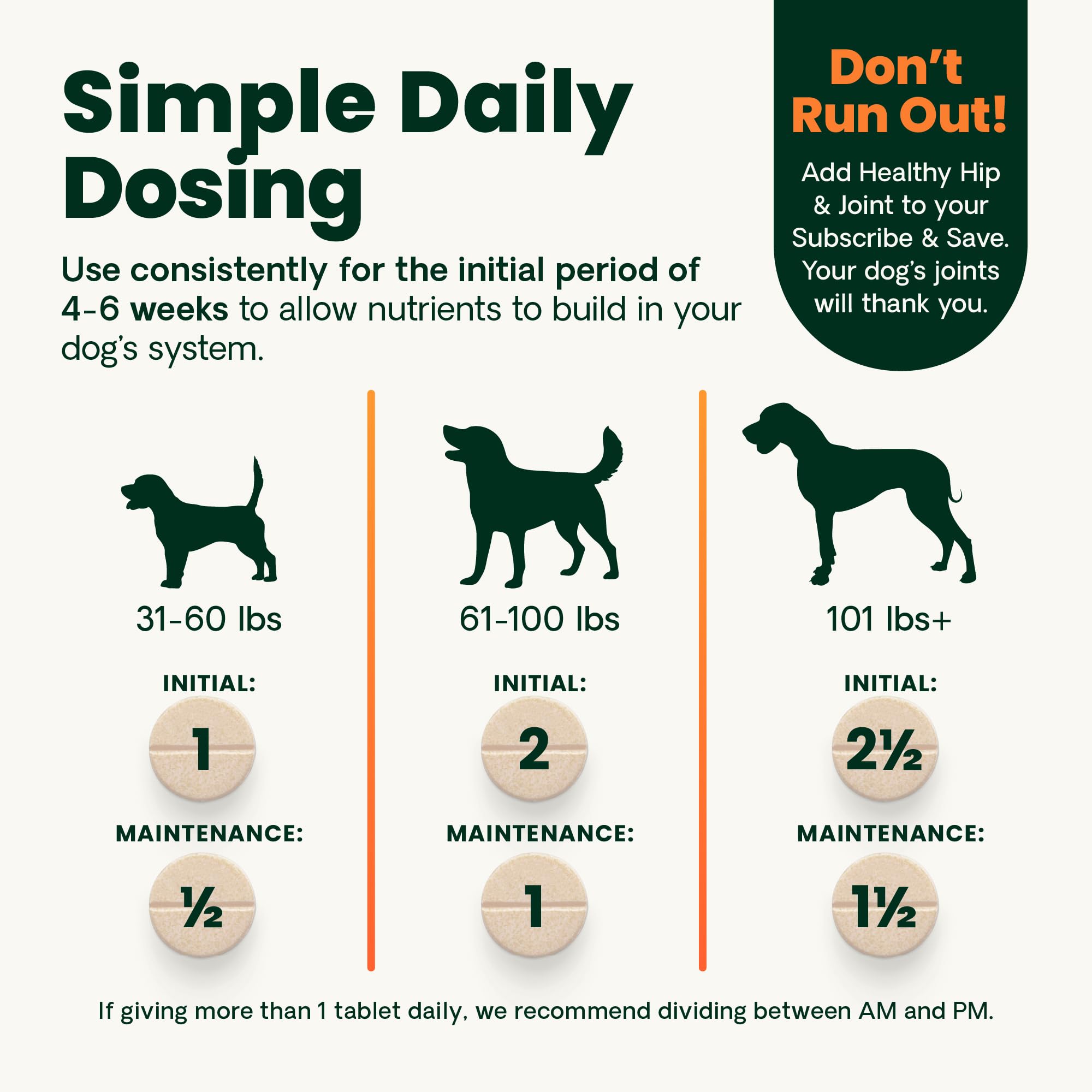 - For Active & Senior Dogs: Bite-sized hip and joint tablets are ideal for dogs that are slowing down or showing signs of fatigue or weakness in their hind quarters as well as active dogs, competitive dogs and dogs that are recovering from orthopedic surgery