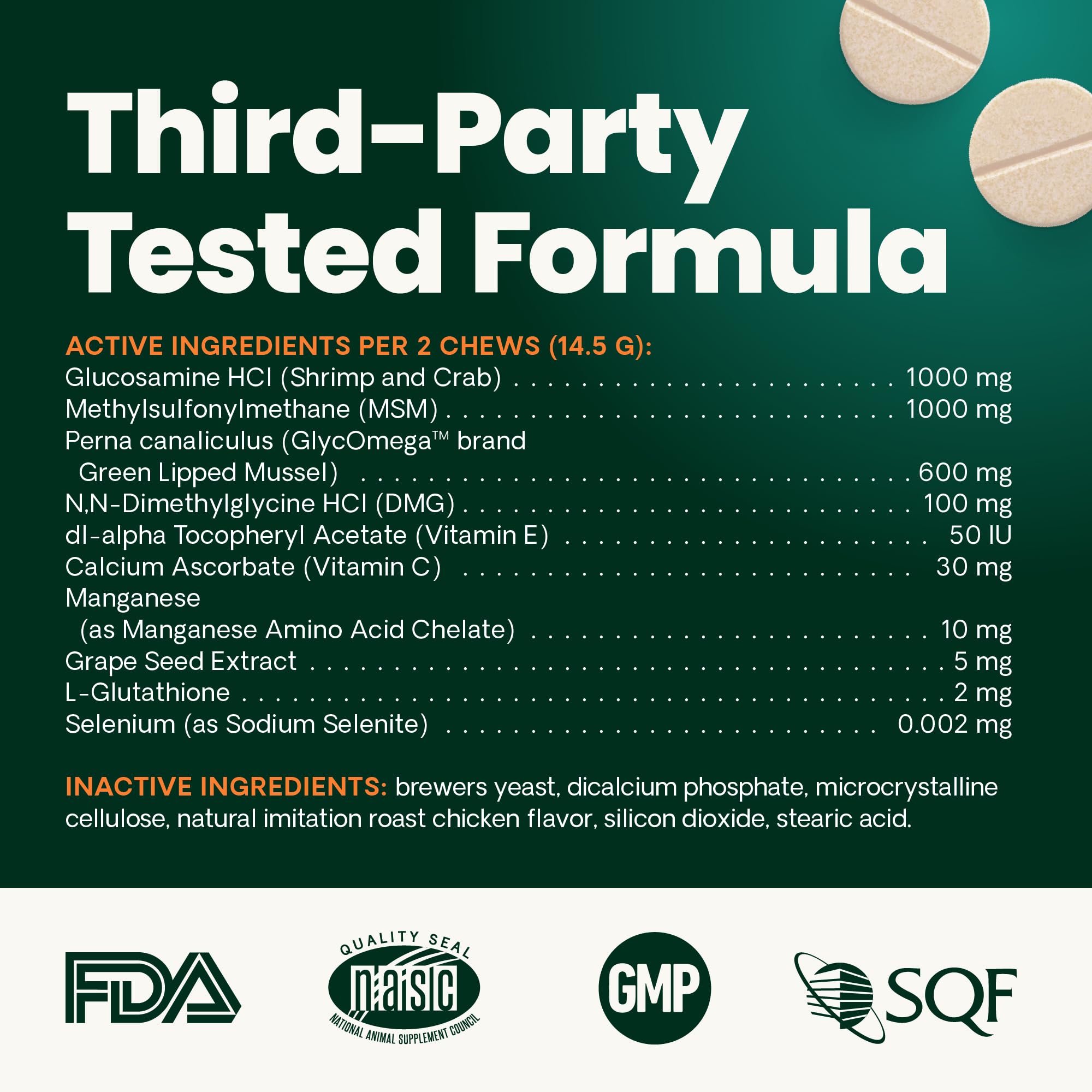 - High-Quality Ingredients: Our vet-formulated dog joint supplements are certified by the National Animal Supplement Council (NASC), routinely undergo third-party testing, and contain no hidden ingredients, artificial flavors, or synthetic colors