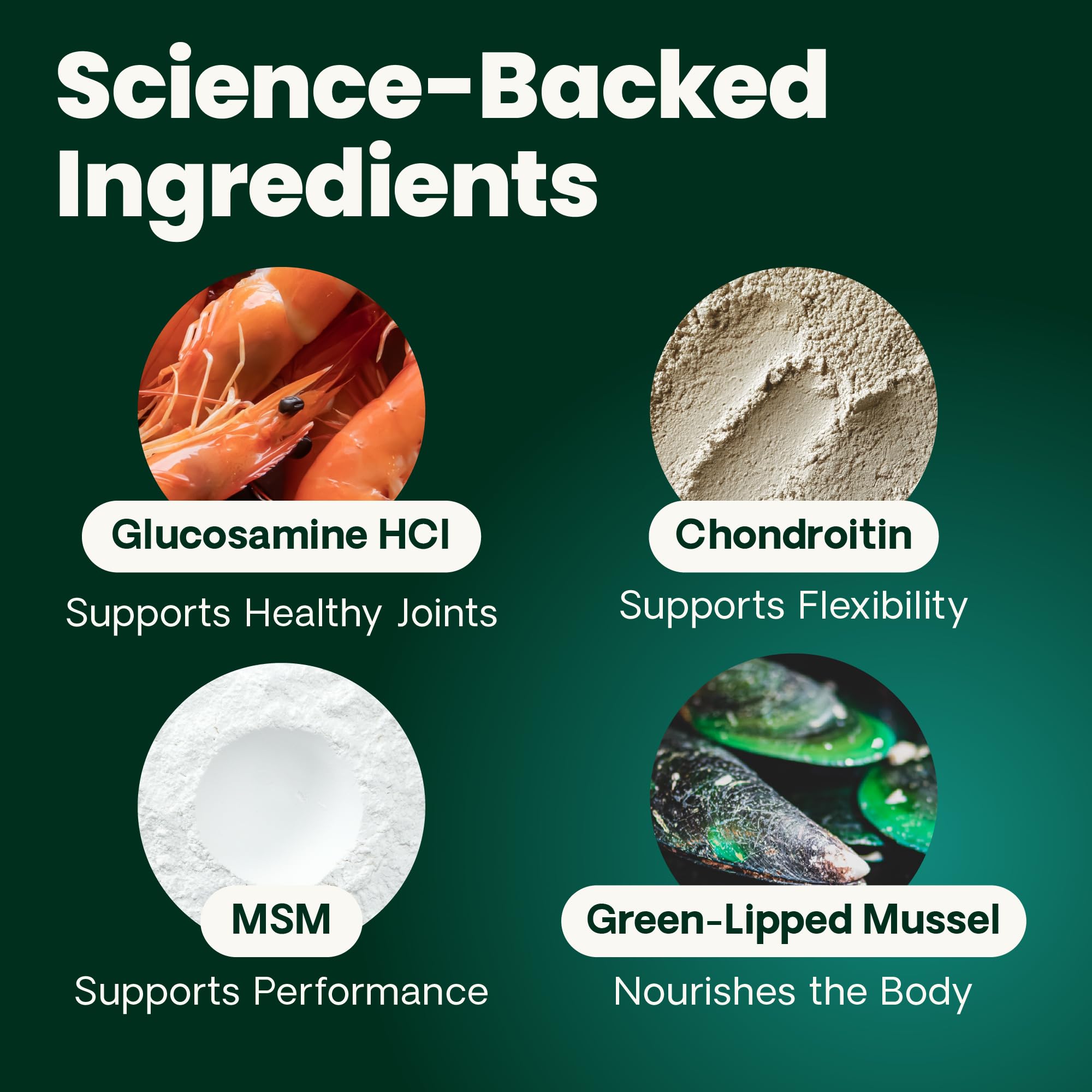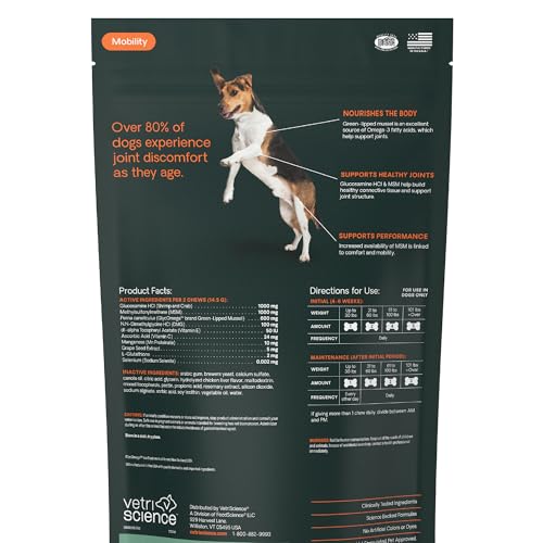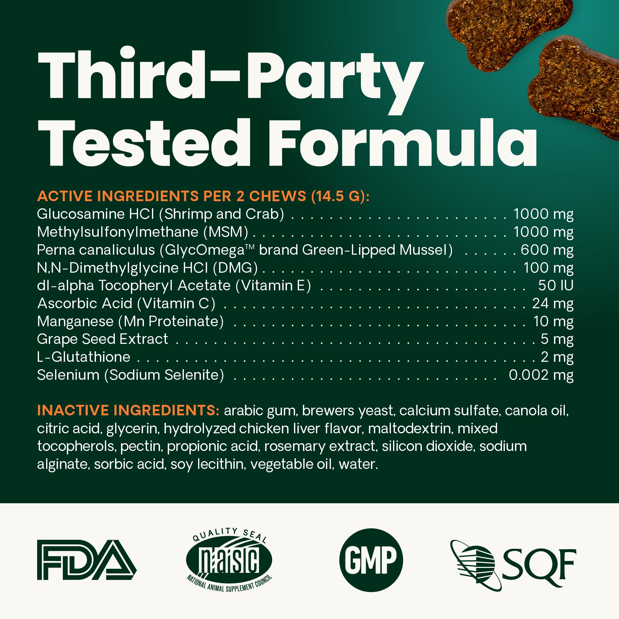 - SCIENCE-BACKED INGREDIENTS FOR JOINT HEALTH & FLEXIBILITY: Each chew features 10 active nutrients including glucosamine HCl, MSM, GlycOmega green-lipped mussel, manganese and vitamins C & E to help maintain cartilage structure, joint strength and range of motion for long-term joint support in dogs.