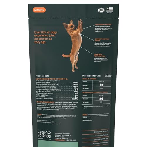 Details: VetriScience Extra Strength Healthy Hip & Joint (new name, same great GlycoFlex Stage 3 formula) is the perfect daily glucosamine joint supplement for young, highly active small dogs and adult dogs needing moderate or advanced joint support and protection. This vet-formulated joint chew for small dogs is made with nutritious, science-backed ingredients like glucosamine and MSM, green-lipped mussel, and antioxidants to help cushion and lubricate joints and keep your small dog flexible and comfortable during everyday activities that may put stress on the body. Pet parents typically report seeing positive effects within 4 weeks of starting their dog on the Extra Strength Healthy Hip & Joint formula. If your small dog is starting to slow down or lose interest in their favorite household and outdoor activities, grab a bag of Extra Strength Healthy Hip & Joint today and see the results for yourself. Once small dogs get a taste of the delicious flavor and chewy texture, they'll be begging for more. Our dog and cat supplements are certified by the National Animal Supplement Council (NASC), routinely undergo third-party testing, and contain no hidden ingredients, artificial flavors, synthetic colors or preservatives.